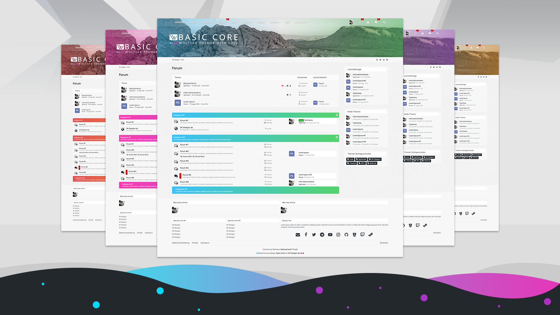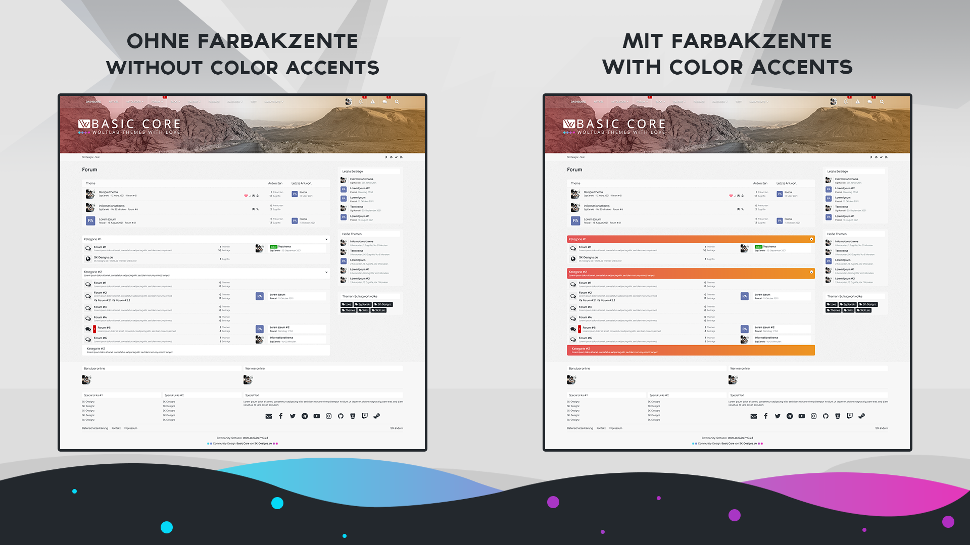 Viele Änderungen wie beispielsweise die Deaktivierung von zusätzlichen (im Design mitgelieferten) Boxen oder die Anpassung dieser ist ohne jegliche besonderen Kenntnisse dank unseres einzigartigen Konfigurationsplugins im ACP innerhalb von wenigen Minuten erledigt. Auch die "Haupt-" bzw. "Akzentfarbe" ist innerhalb weniger Sekunden im Stileditor via "Farbanpassung" schnell und einfach erledigt. Desweiteren ist es möglich innerhalb des Konfigurationsplugins spezielle Änderungen für die Desktop- sowie Mobile Variante getrennt vorzunehmen.