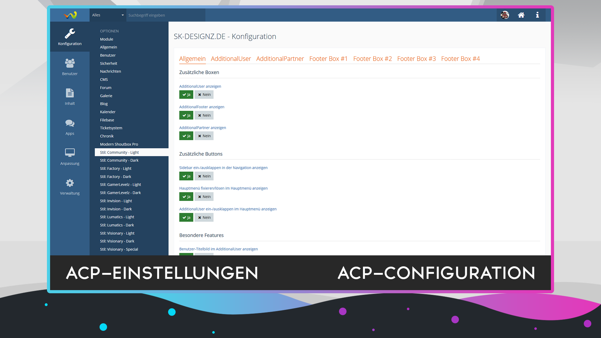 Im Design sind einige speziell entwickelte / angepasste Boxen integriert, welche sich allesamt mühelos durch unseres Konfigurationsplugin einstellen und auch problemlos deaktivieren lassen.