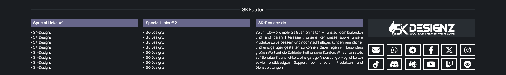 Mit der Footer-Box erhalten Sie die Möglichkeit wichtige Verlinkungen prominent und gut sichtbar im Fußbereich der Seite zu platzieren. Hierbei wird zwischen 2 verschiedenen Kategorien mit jeweils 8 möglichen Verlinkungen unterschieden. Zusätzlich können Sie nicht nur Ihr Logo und Ihre Social-Media Kanäle einbinden sondern auch zusätzlich eine kurze Beschreibung Ihrer Website / Ihres Projekts einbinden.