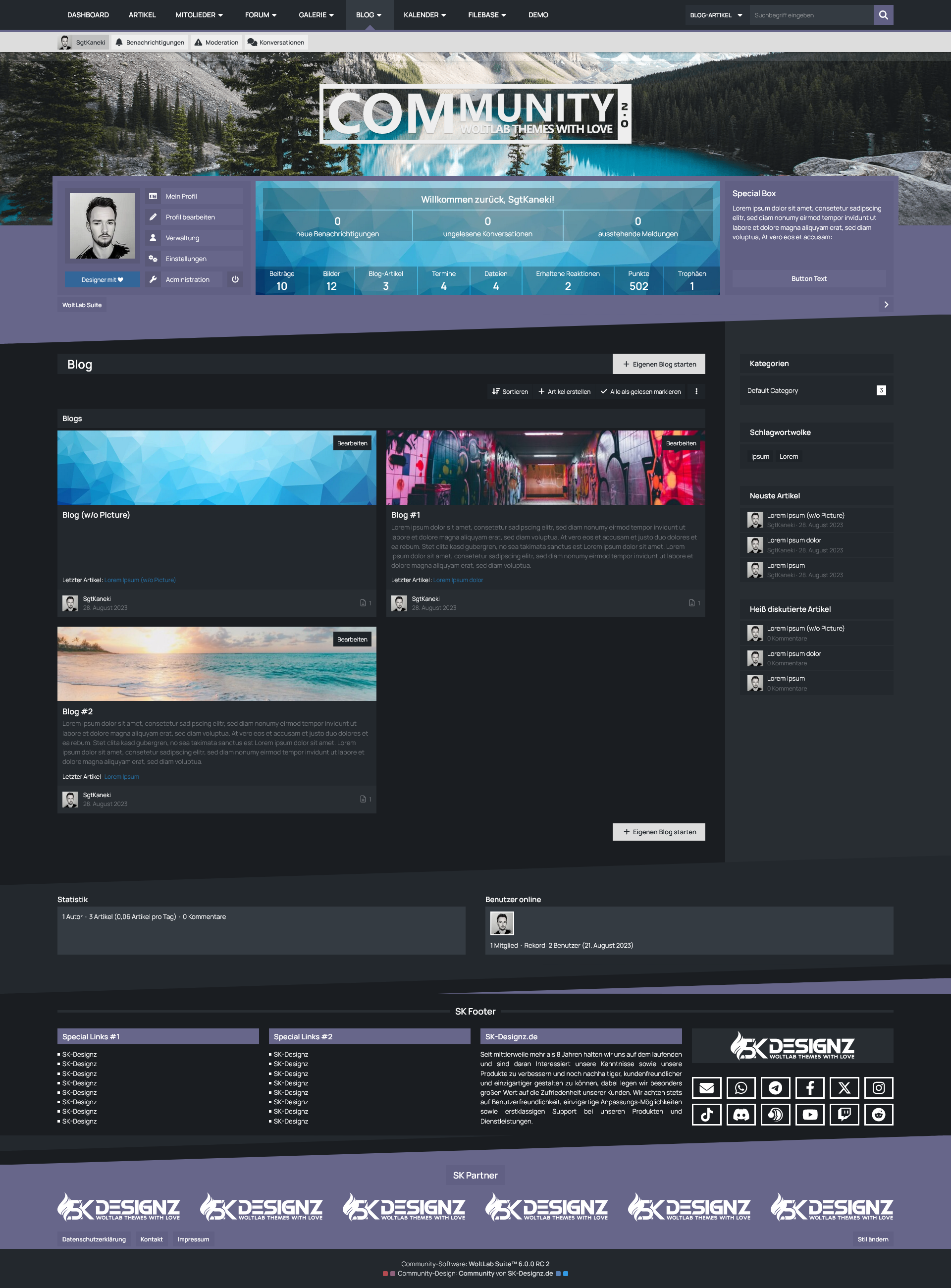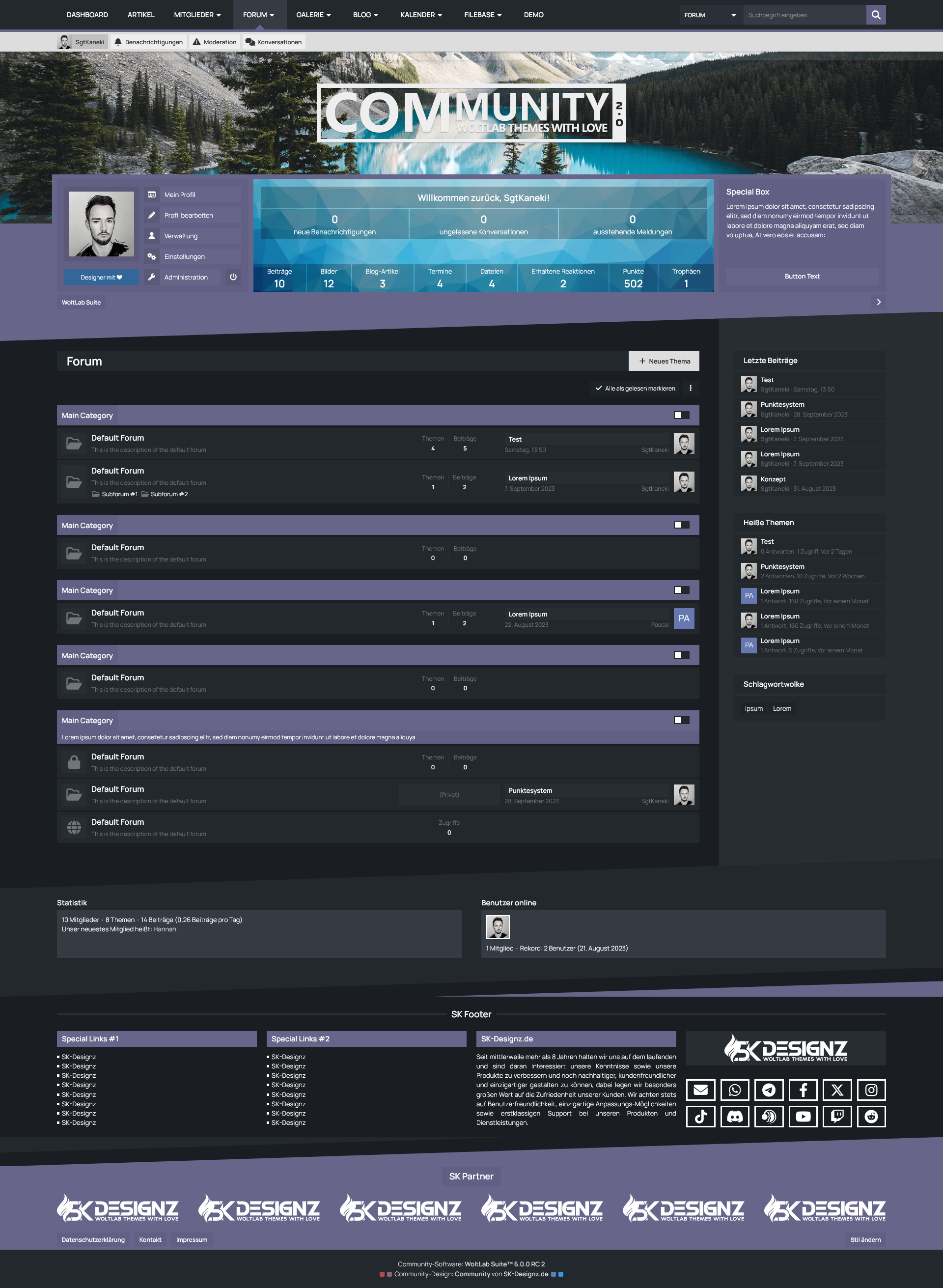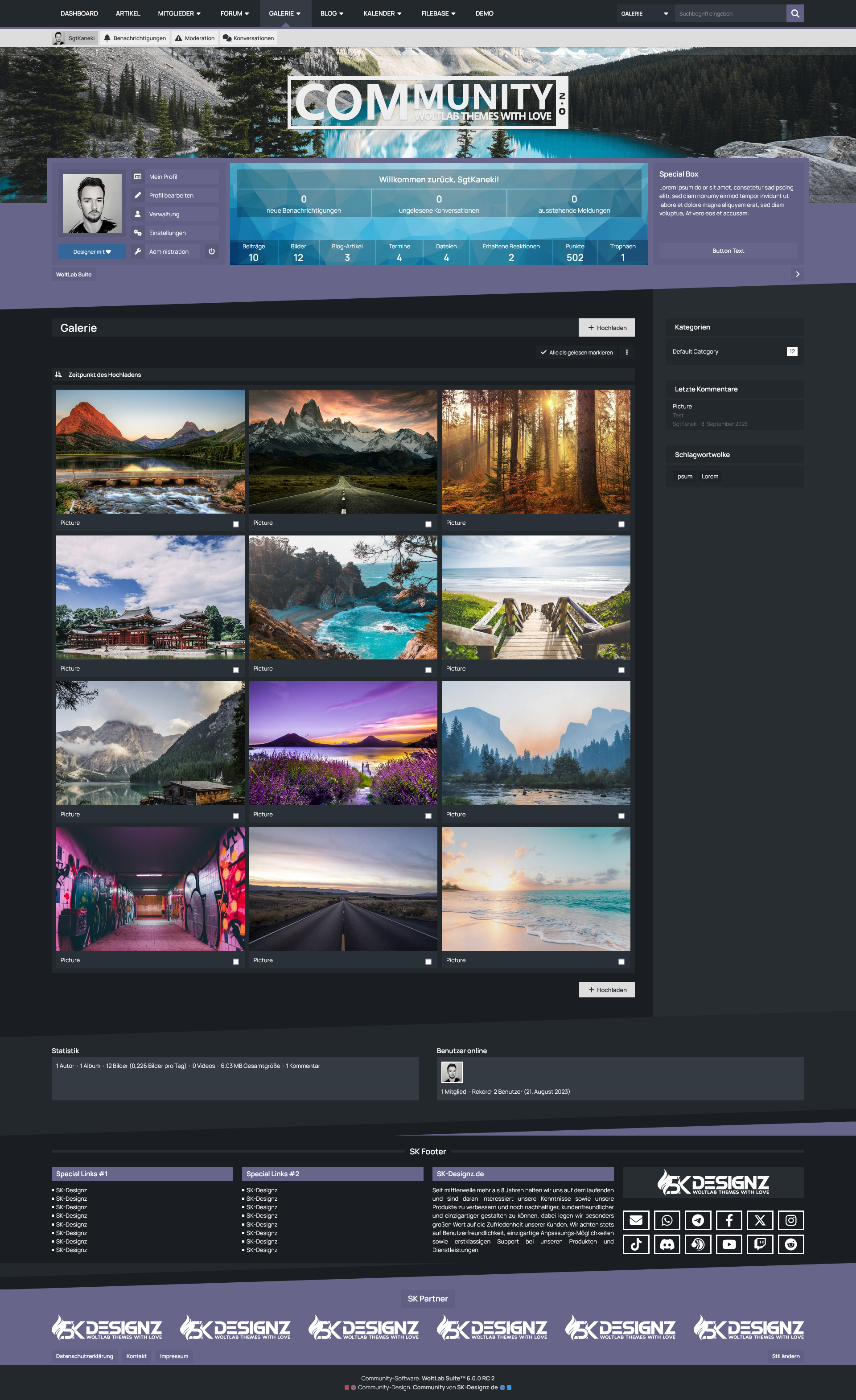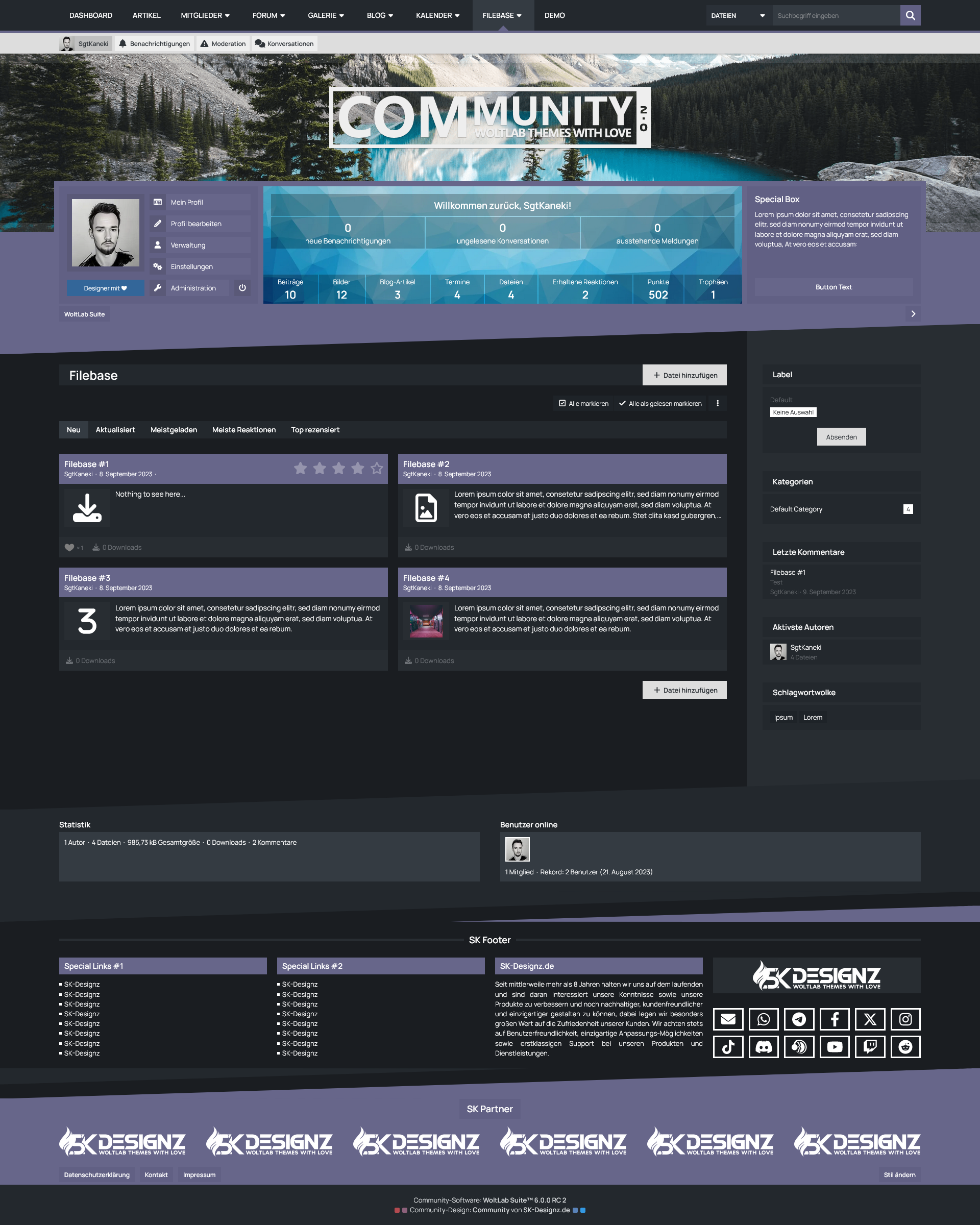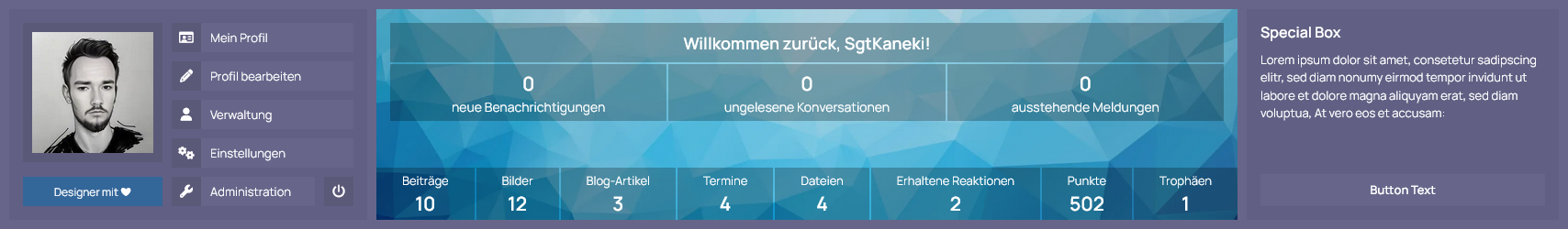 Mit der Benutzer-Box erhalten Ihre Benutzer eine sinnvolle Übersicht des eigenen Benutzerprofils prominent unter dem Header der Seite platziert. Dort befinden sich sowohl die wichtigsten Shortcuts um das eigene Profil zu verwalten, als auch die eigenen Statistiken und Benachrichtungen im Überblick zu behalten. Für Gäste hingegen bietet diese Box die Möglichkeit eine kurze Beschreibung Ihrer Website zu hinterlegen und die Möglichkeit sich entweder einzuloggen oder ein Benutzerkonto zu erstellen.