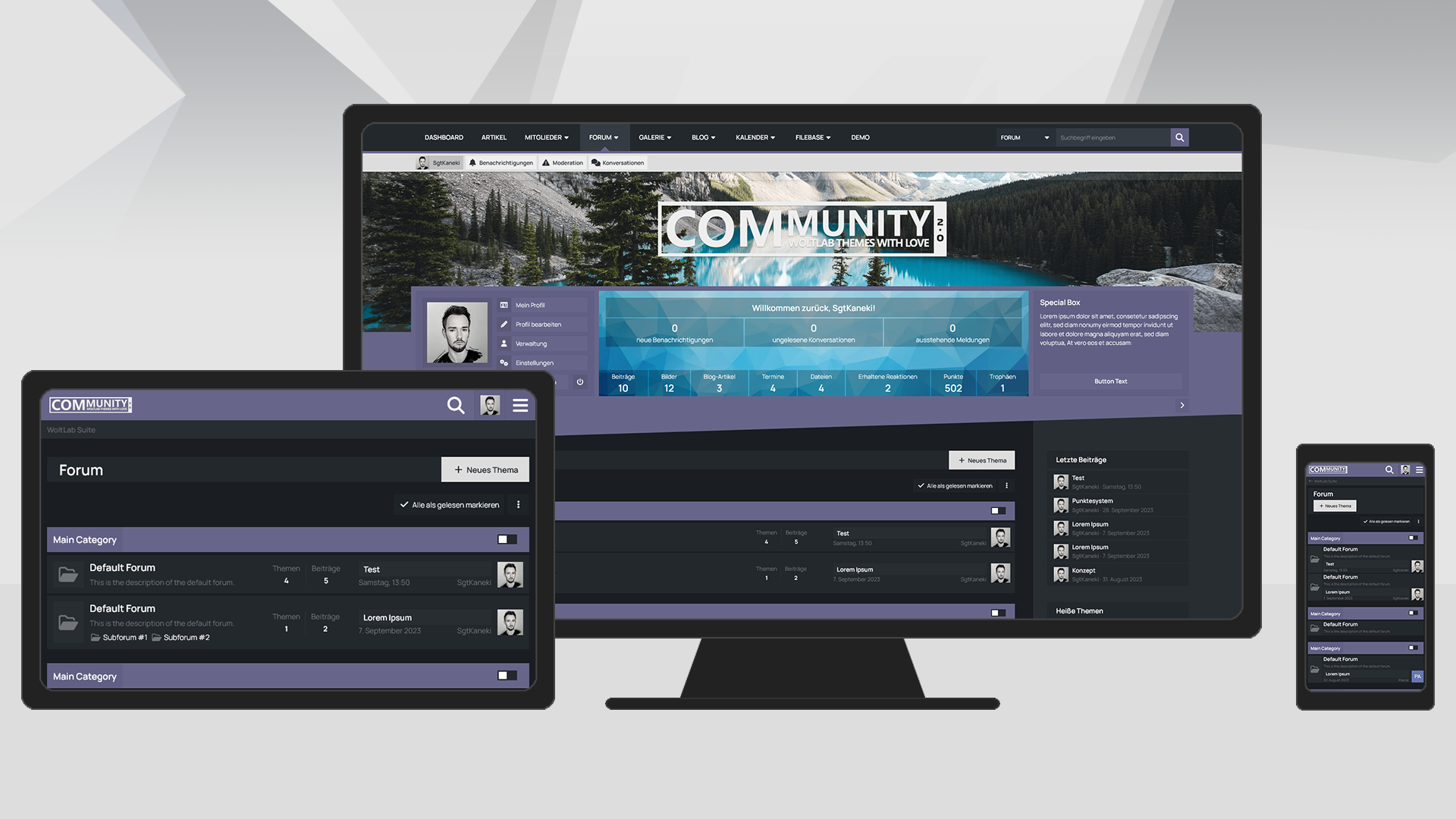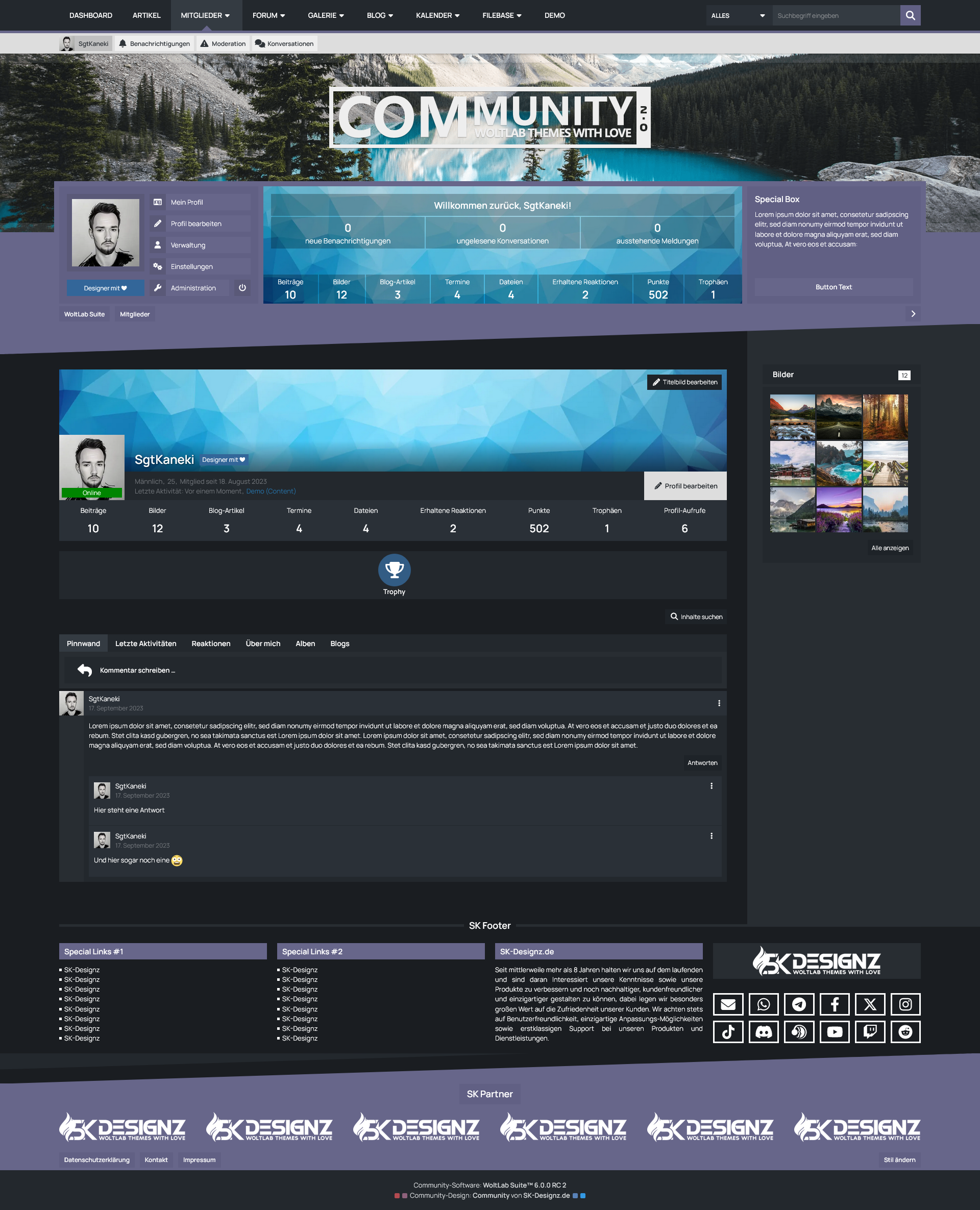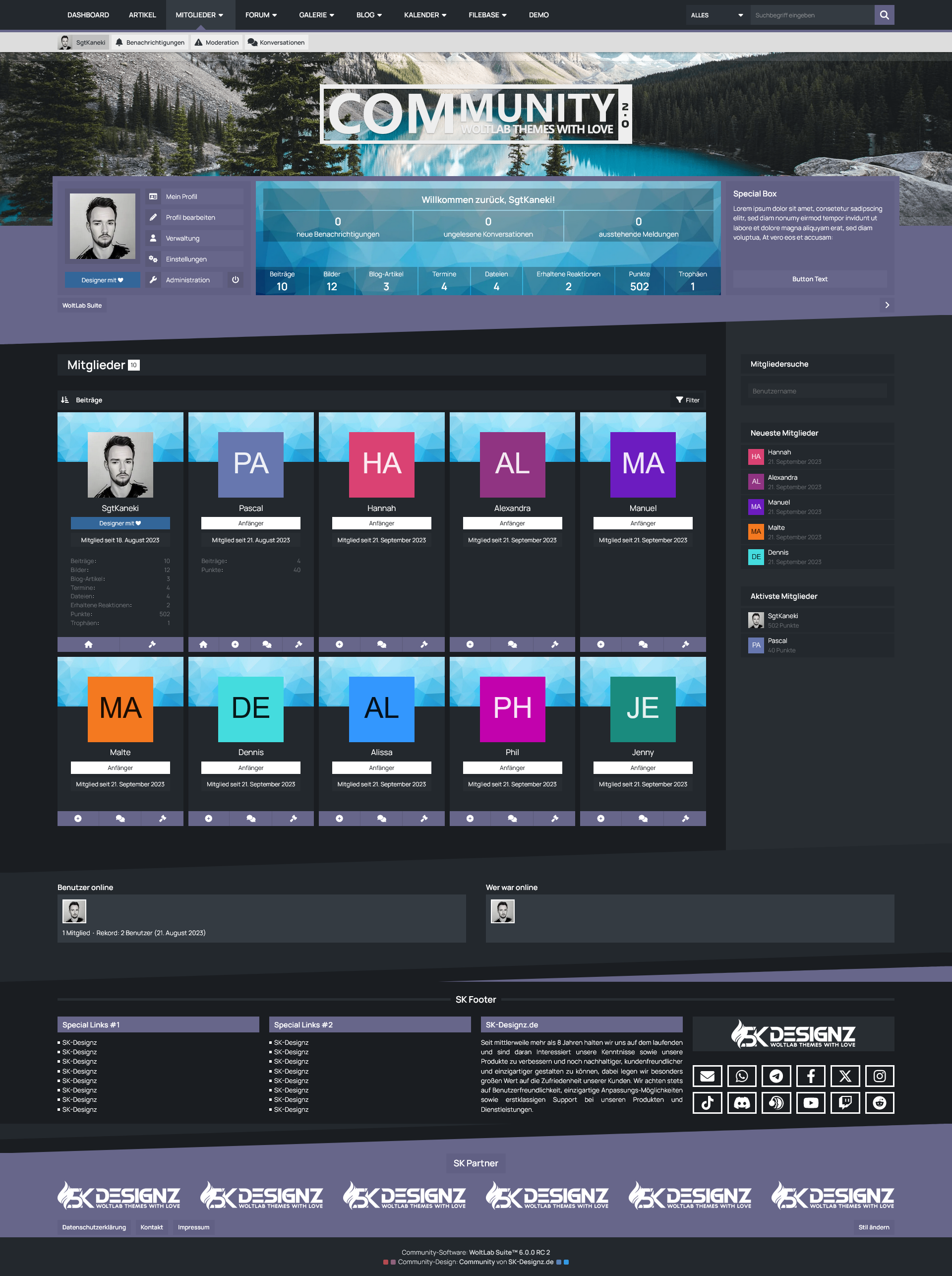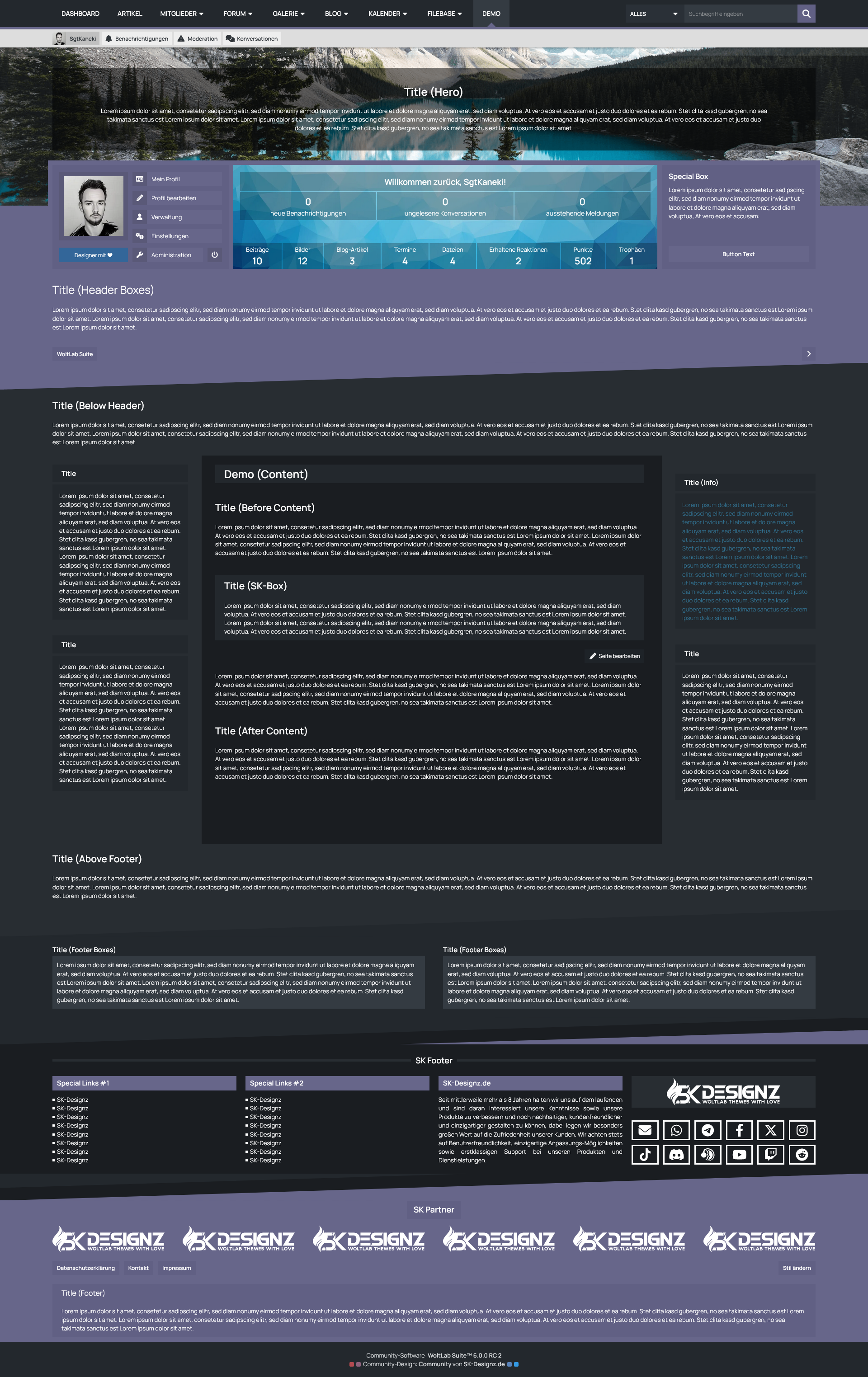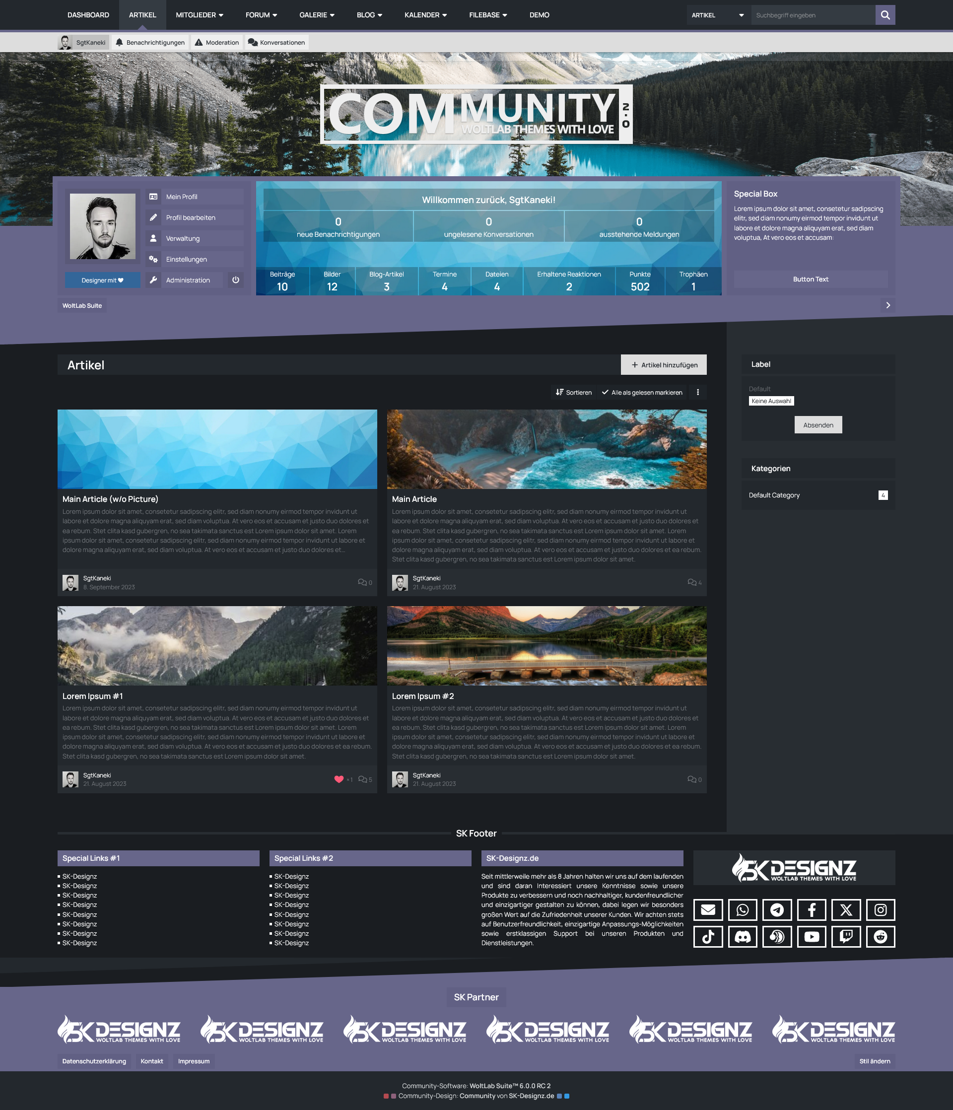 Mit der Benutzer-Box erhalten Ihre Benutzer eine sinnvolle Übersicht des eigenen Benutzerprofils prominent unter dem Header der Seite platziert. Dort befinden sich sowohl die wichtigsten Shortcuts um das eigene Profil zu verwalten, als auch die eigenen Statistiken und Benachrichtungen im Überblick zu behalten. Für Gäste hingegen bietet diese Box die Möglichkeit eine kurze Beschreibung Ihrer Website zu hinterlegen und die Möglichkeit sich entweder einzuloggen oder ein Benutzerkonto zu erstellen.