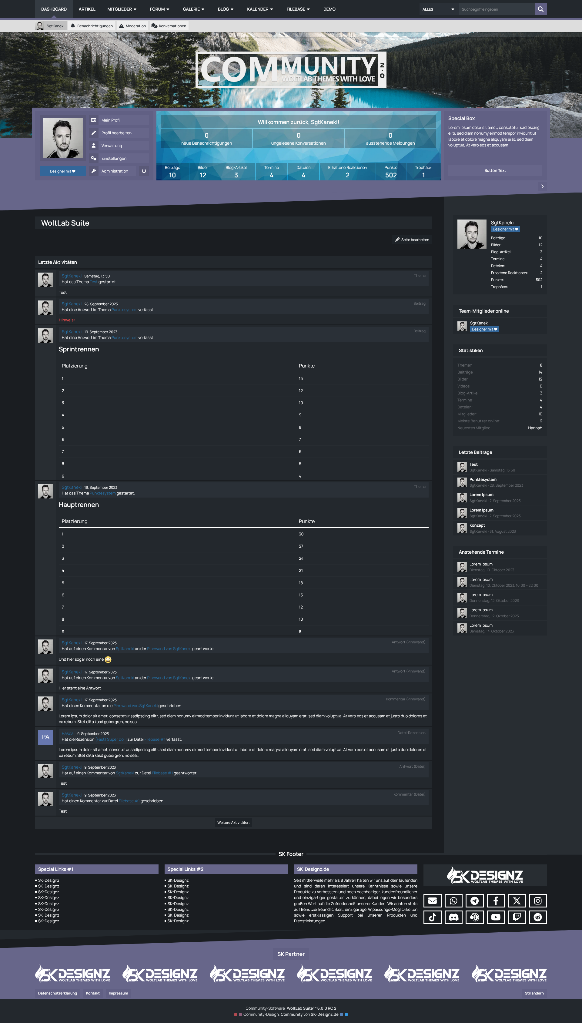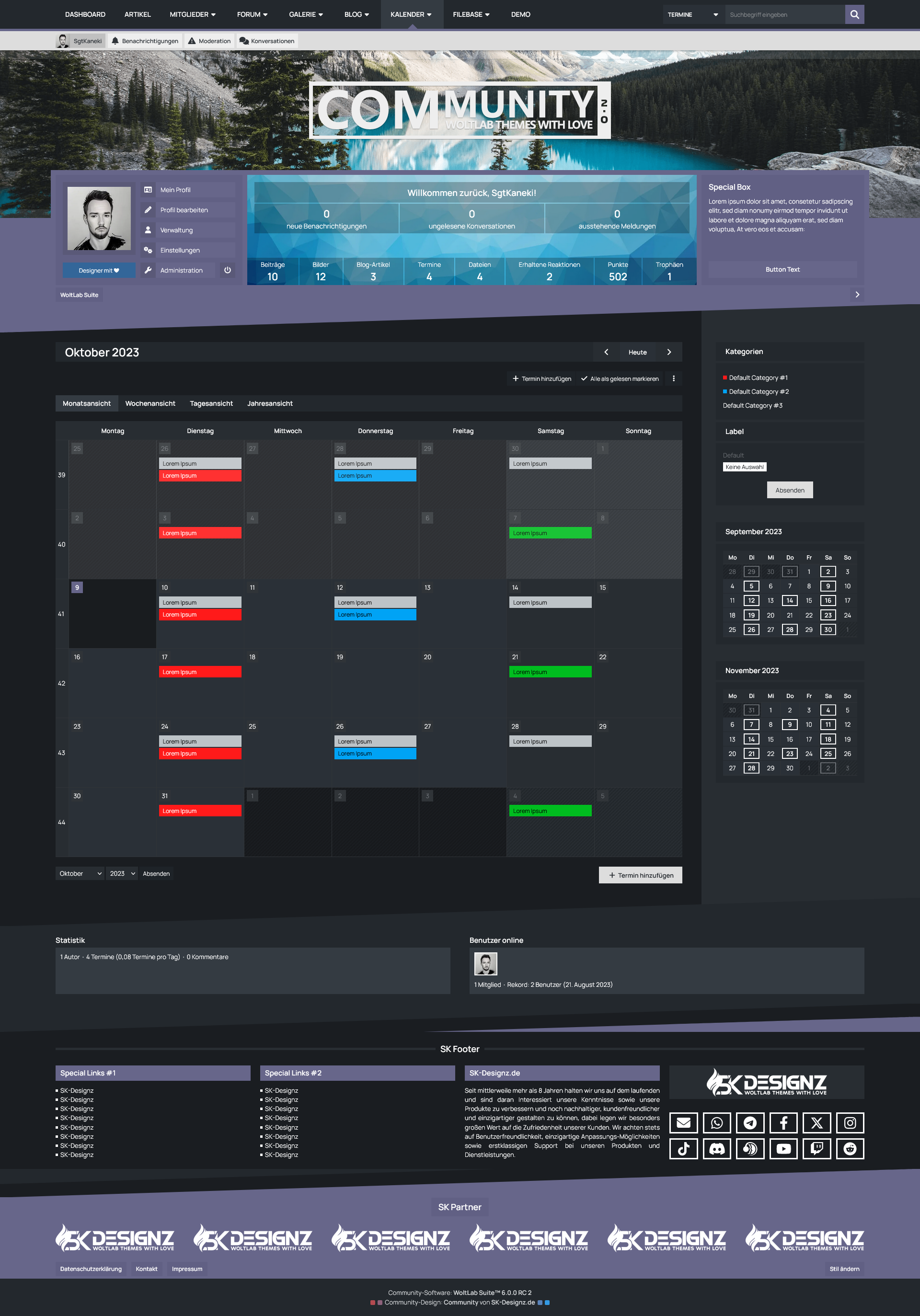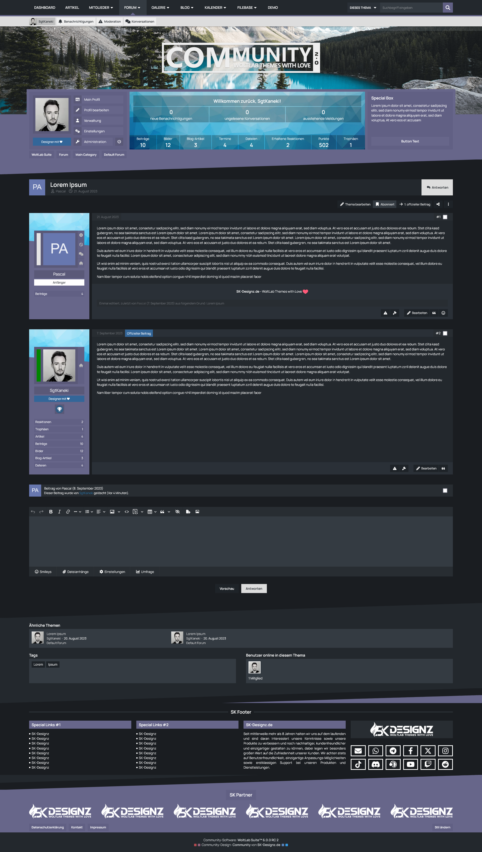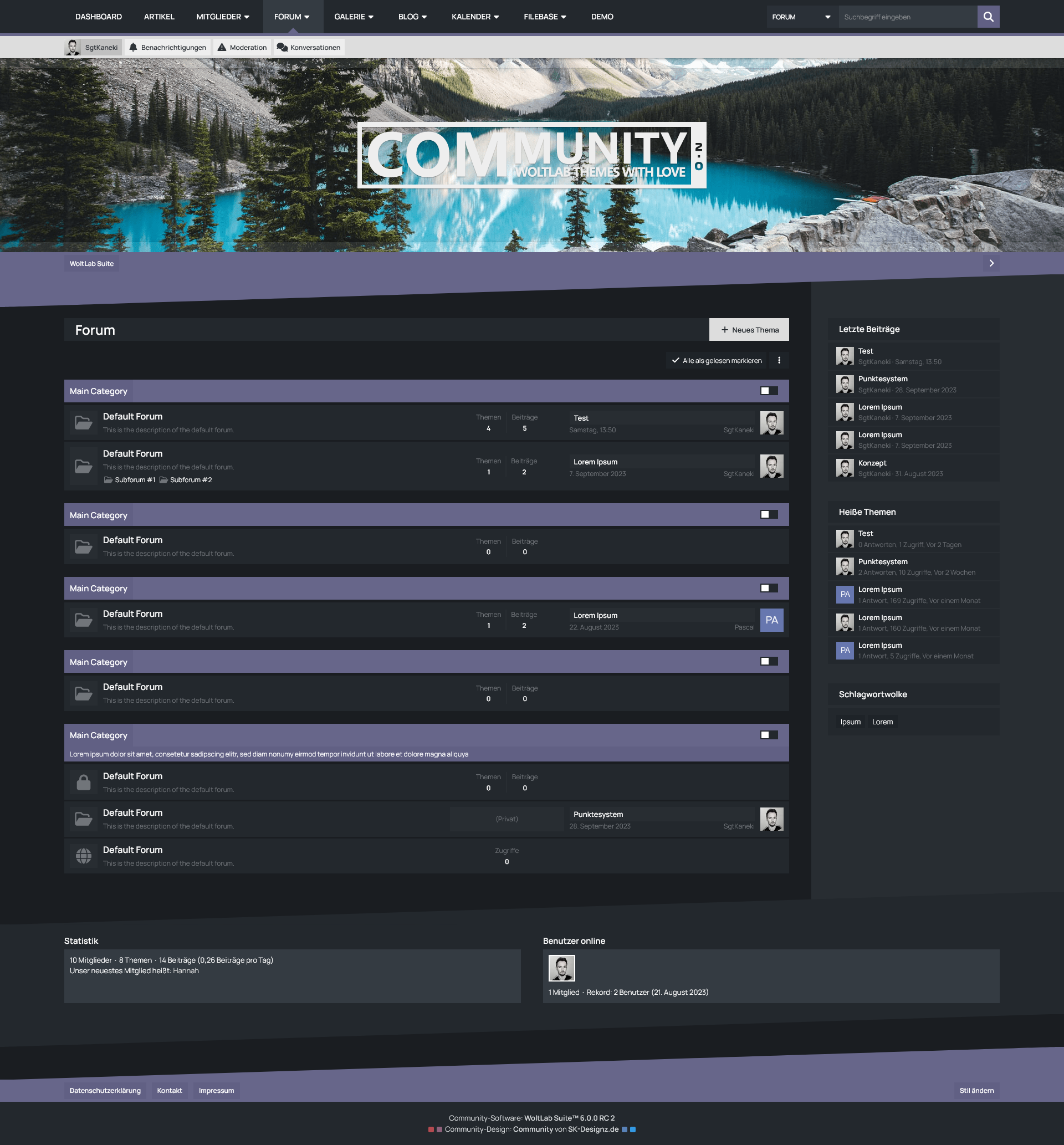 Mit der Benutzer-Box erhalten Ihre Benutzer eine sinnvolle Übersicht des eigenen Benutzerprofils prominent unter dem Header der Seite platziert. Dort befinden sich sowohl die wichtigsten Shortcuts um das eigene Profil zu verwalten, als auch die eigenen Statistiken und Benachrichtungen im Überblick zu behalten. Für Gäste hingegen bietet diese Box die Möglichkeit eine kurze Beschreibung Ihrer Website zu hinterlegen und die Möglichkeit sich entweder einzuloggen oder ein Benutzerkonto zu erstellen.