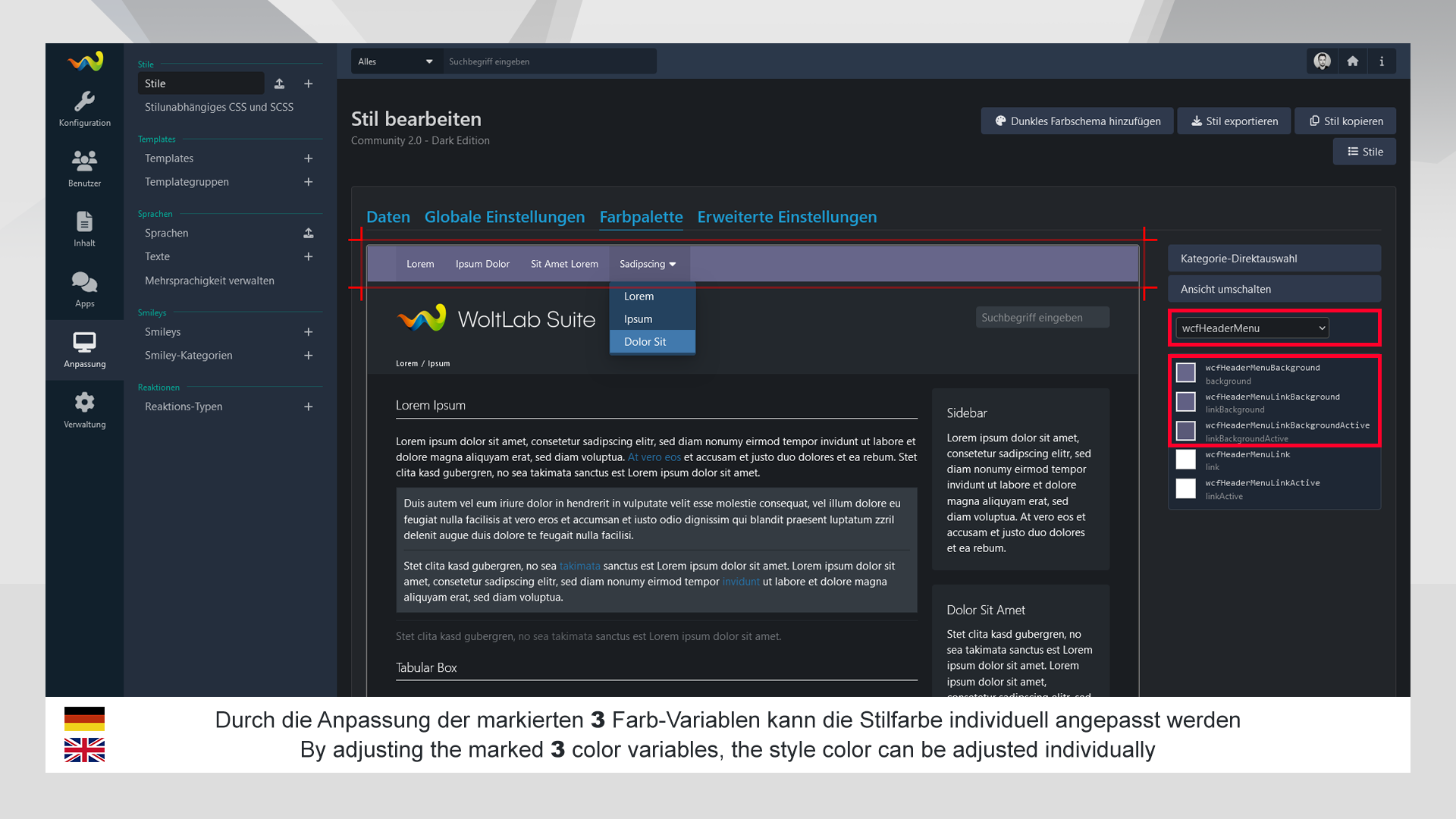Damit Ihr Stil auch zu Ihnen und Ihrer Community passt bieten wir auch hier maximale Individualisierung und Farbanpassungsmöglichkeiten. Es ist möglich innerhalb von nur wenigen Handgriffen - und ohne besondere Kenntnisse - die Hauptfarbe vom Stil nach Ihren Wünschen und Ihren Bedürfnissen anzupassen. Es ist selbstverständlich ebenfalls möglich mehrere Farbkombinationen anzubieten, hierzu können Sie den Stil beliebig oft kopieren.