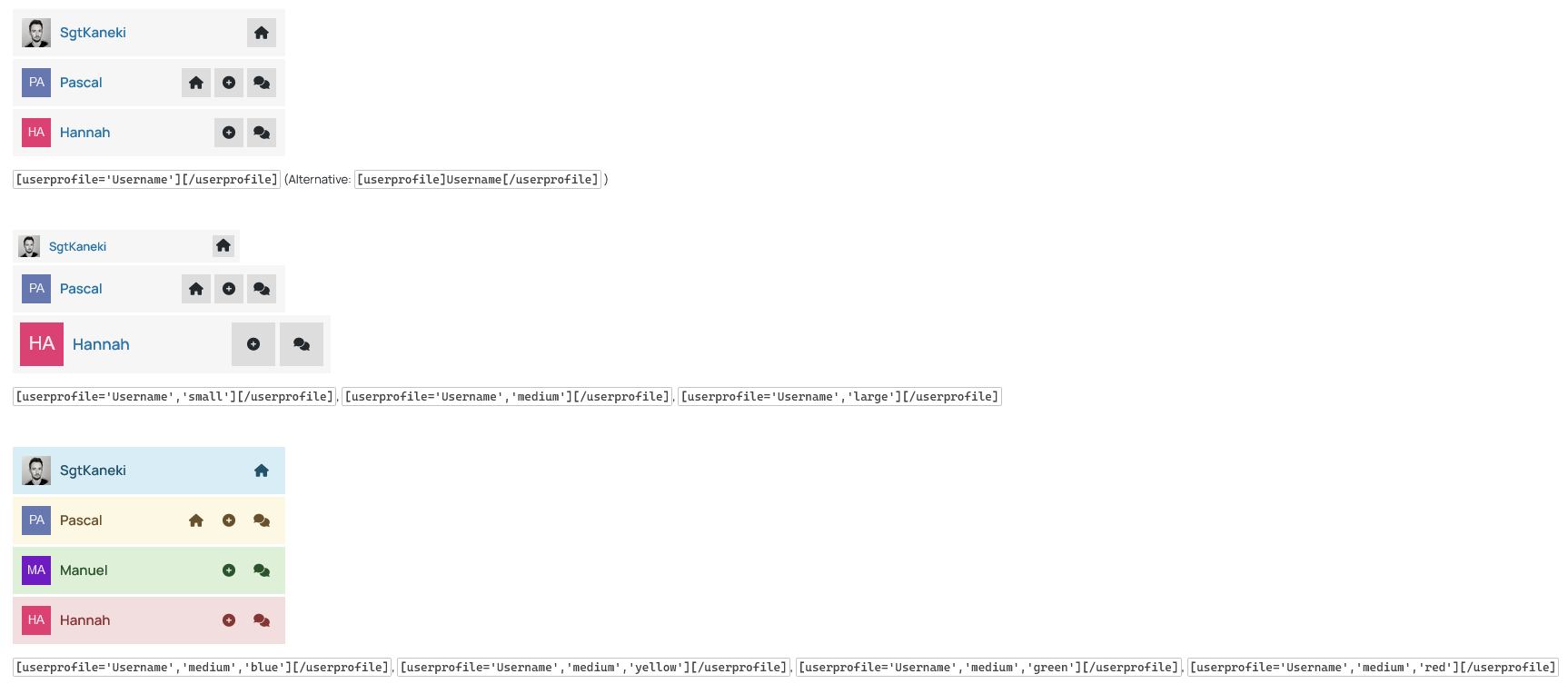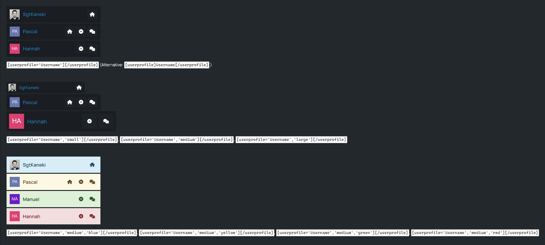 [userprofile]SgtKaneki[/userprofile] oder [userprofile='SgtKaneki','large','blue'][/userprofile]