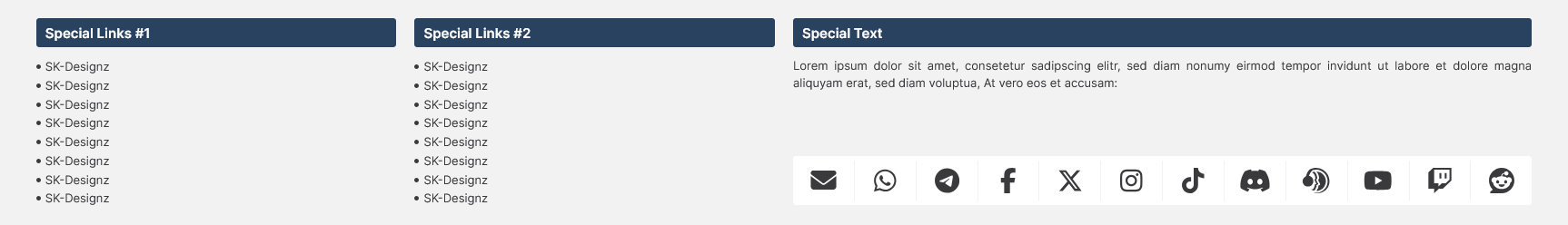 Mit diesen beiden InfoBoxen Sie die Möglichkeit wichtige Verlinkungen / Informationen übersicht direkt unter dem eigentlichen Content zu platzieren. Es besteht die Möglichkeit sowohl ein Icon, als auch ein Button samt Verlinkung Ihren Benutzern zur Verfügung zu stellen. Dort können beispielsweise der eigene Discord / TeamSpeak oder auch GameServer beworben werden, die Möglichkeiten sind hier allerdings (nahezu) unbegrenzt.