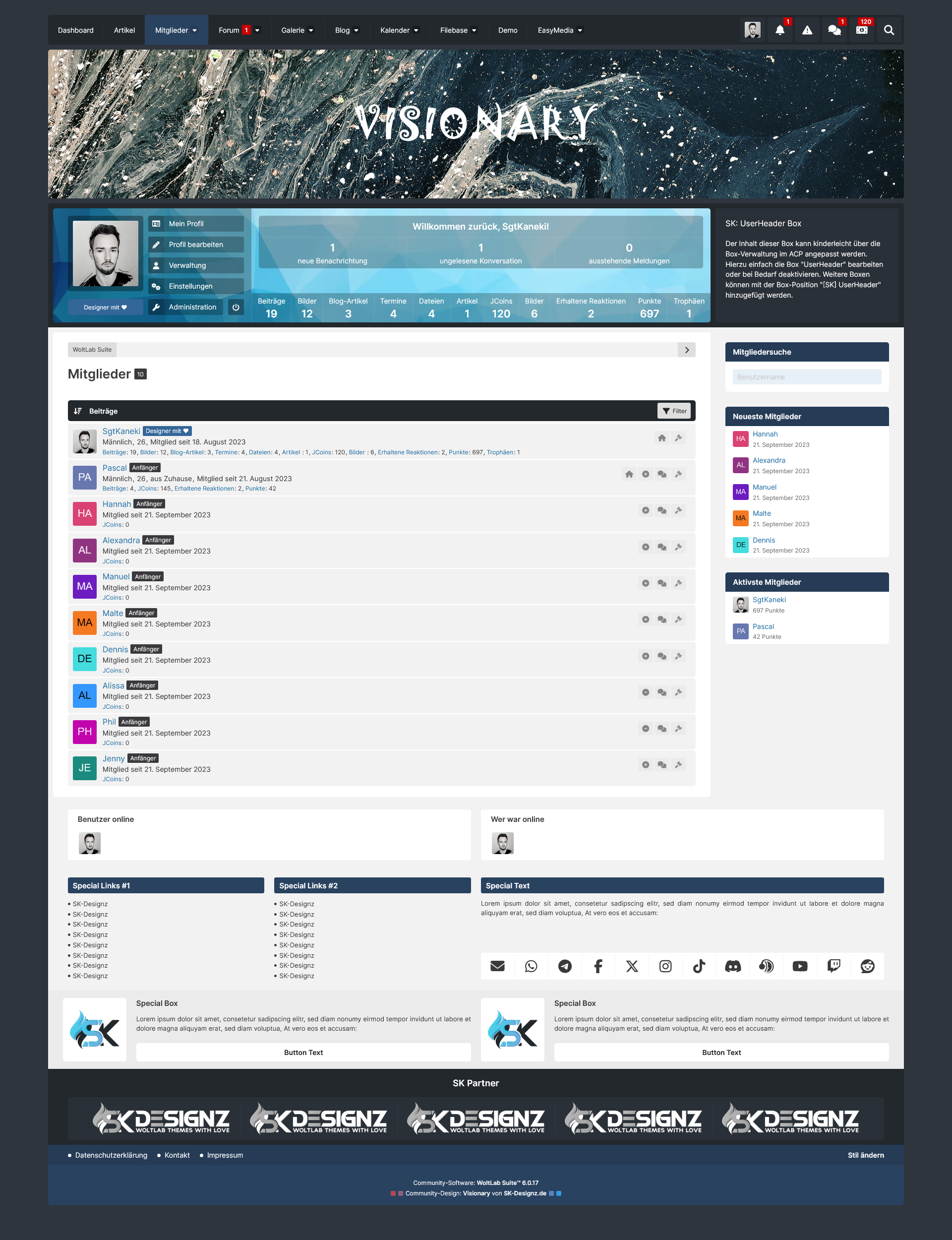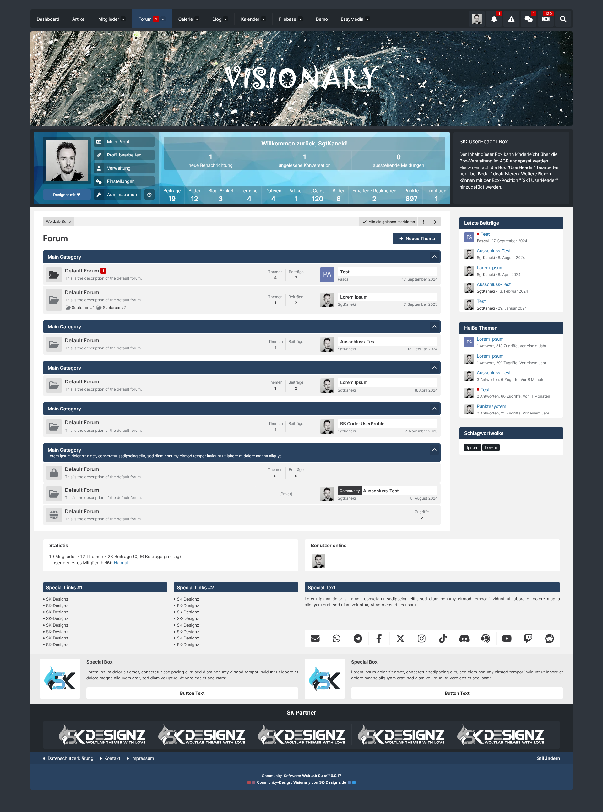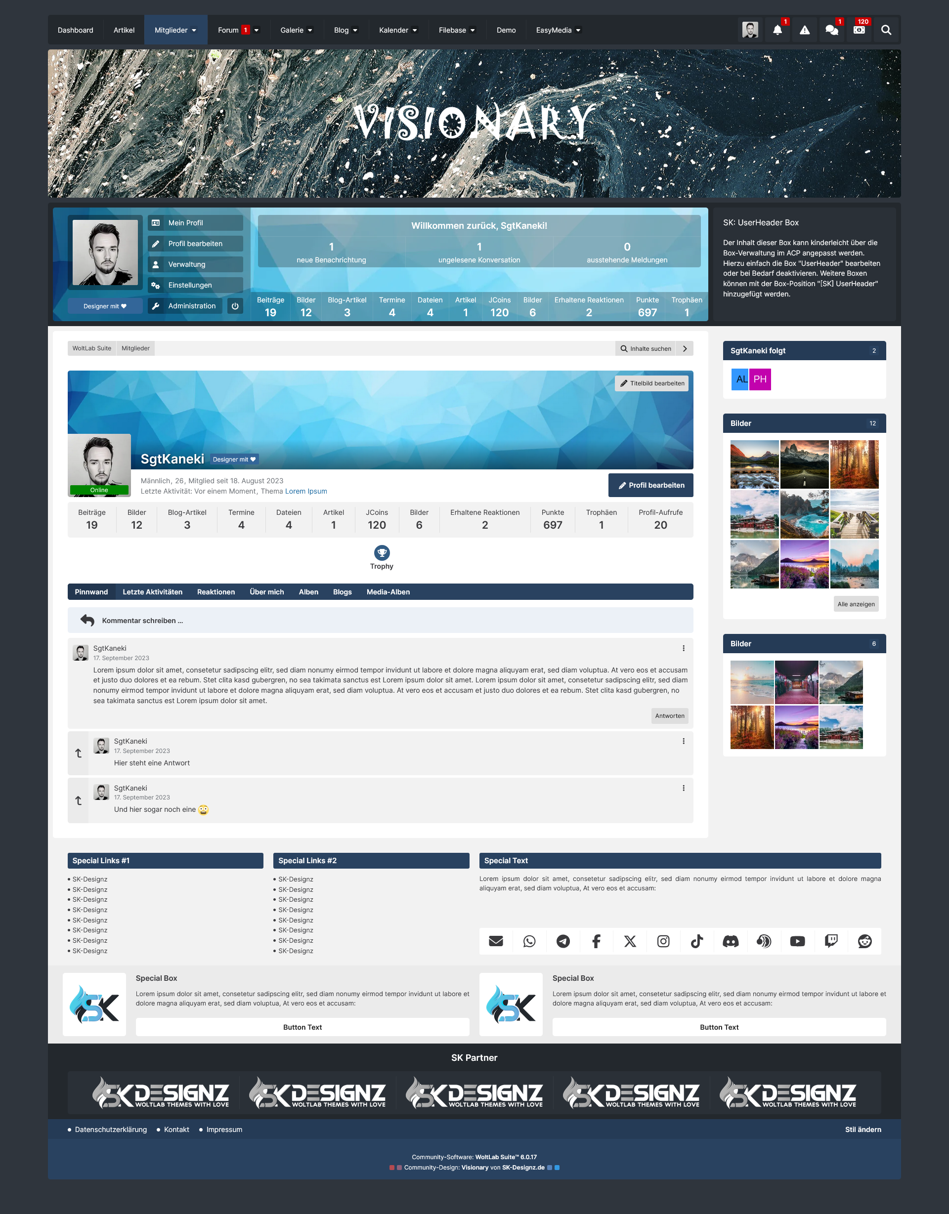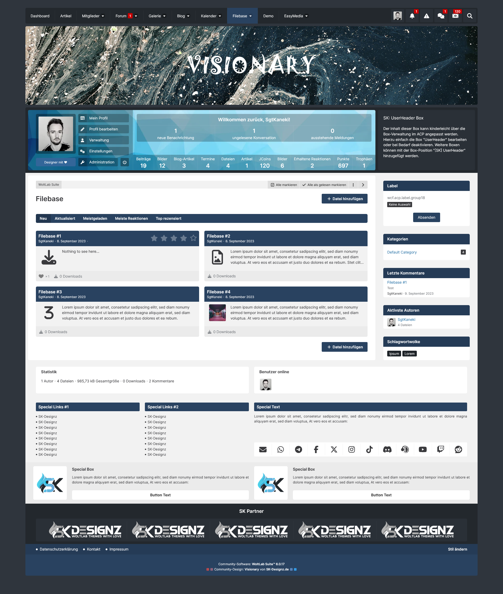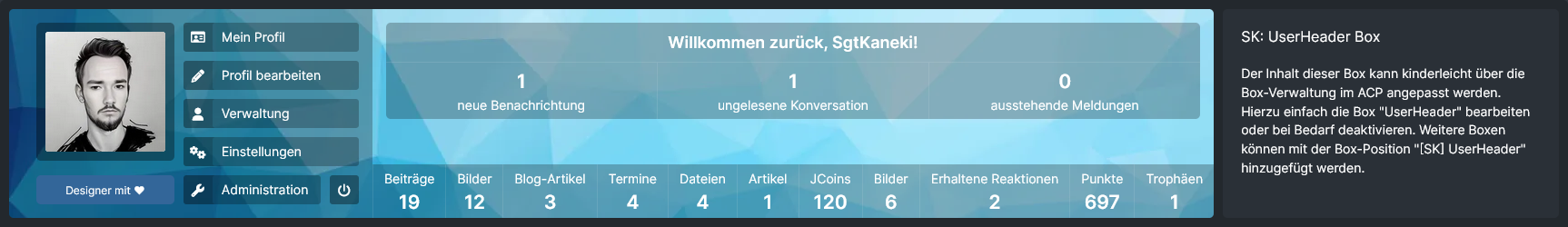 Mit der Benutzer-Box erhalten Ihre Benutzer eine sinnvolle Übersicht des eigenen Benutzerprofils prominent unter dem Header der Seite platziert. Dort befinden sich sowohl die wichtigsten Shortcuts um das eigene Profil zu verwalten, als auch die eigenen Statistiken und Benachrichtungen im Überblick zu behalten. Für Gäste hingegen bietet diese Box die Möglichkeit eine kurze Beschreibung Ihrer Website zu hinterlegen und die Möglichkeit sich entweder einzuloggen oder ein Benutzerkonto zu erstellen.
