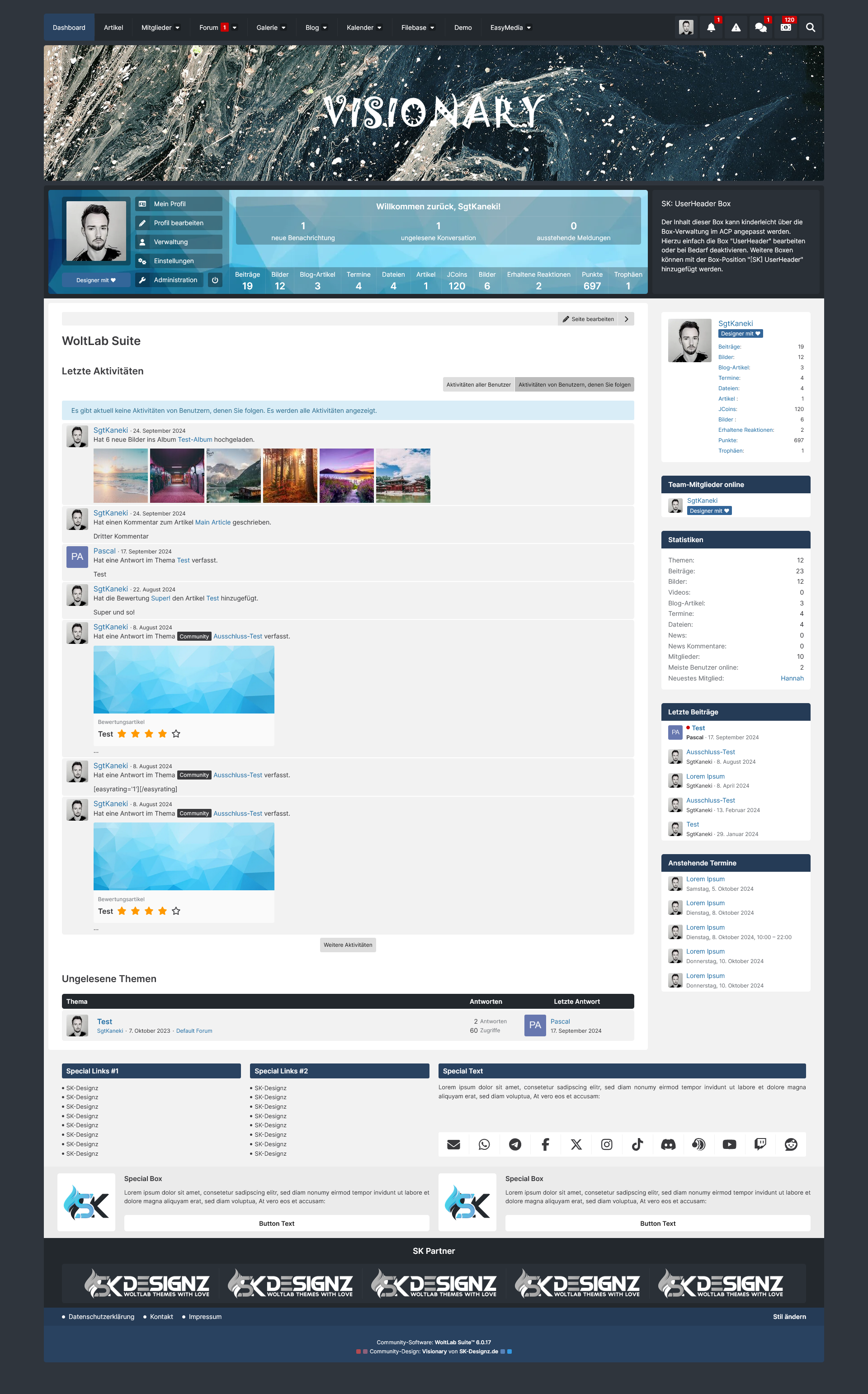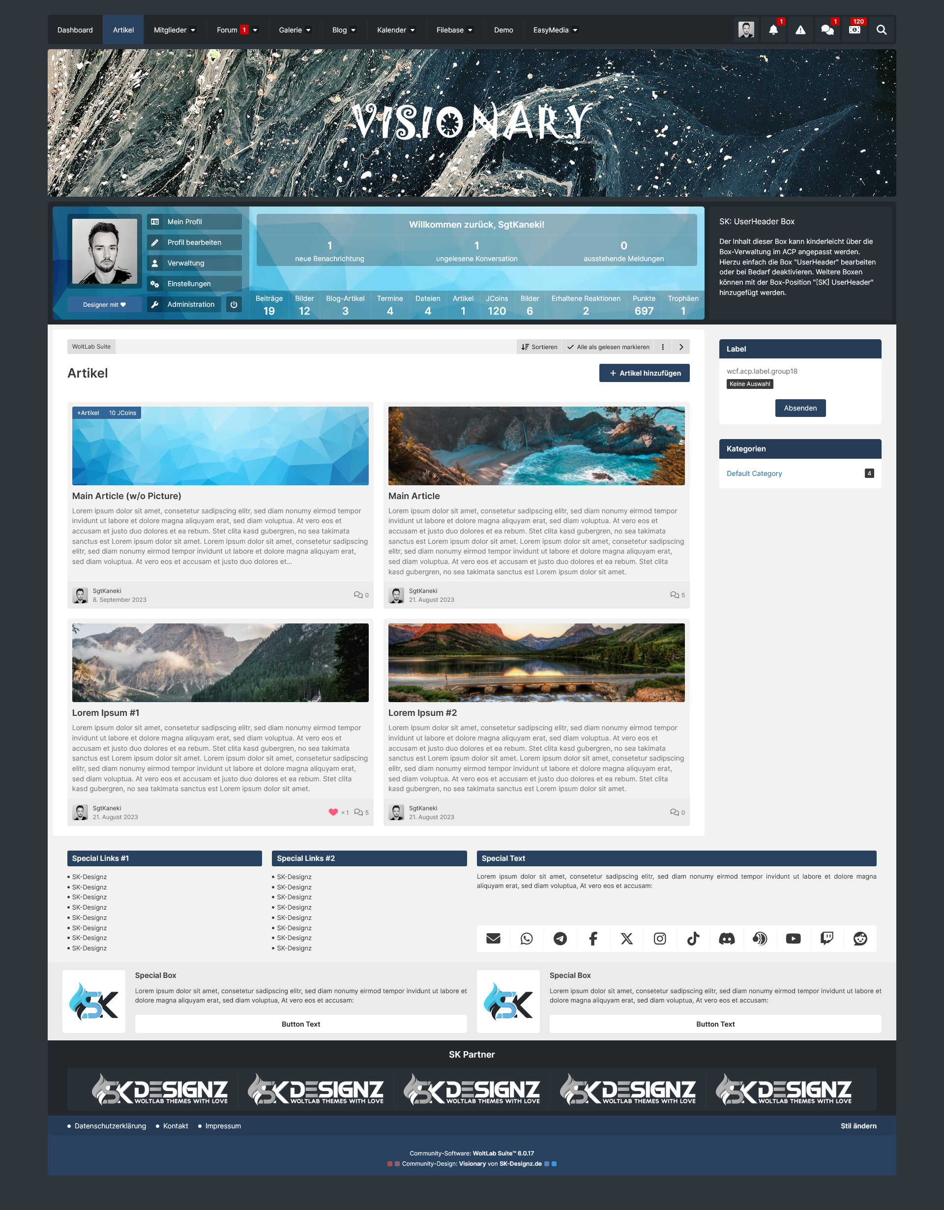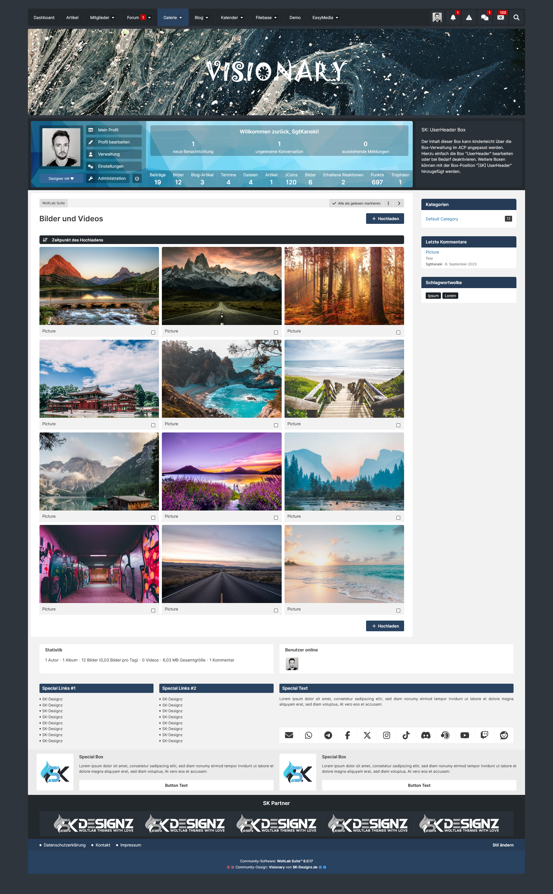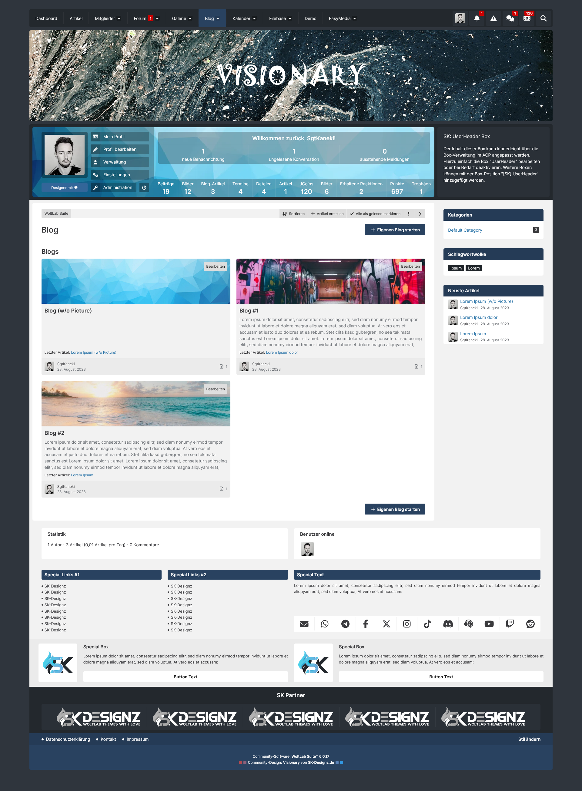 Mit der Benutzer-Box erhalten Ihre Benutzer eine sinnvolle Übersicht des eigenen Benutzerprofils prominent unter dem Header der Seite platziert. Dort befinden sich sowohl die wichtigsten Shortcuts um das eigene Profil zu verwalten, als auch die eigenen Statistiken und Benachrichtungen im Überblick zu behalten. Für Gäste hingegen bietet diese Box die Möglichkeit eine kurze Beschreibung Ihrer Website zu hinterlegen und die Möglichkeit sich entweder einzuloggen oder ein Benutzerkonto zu erstellen.