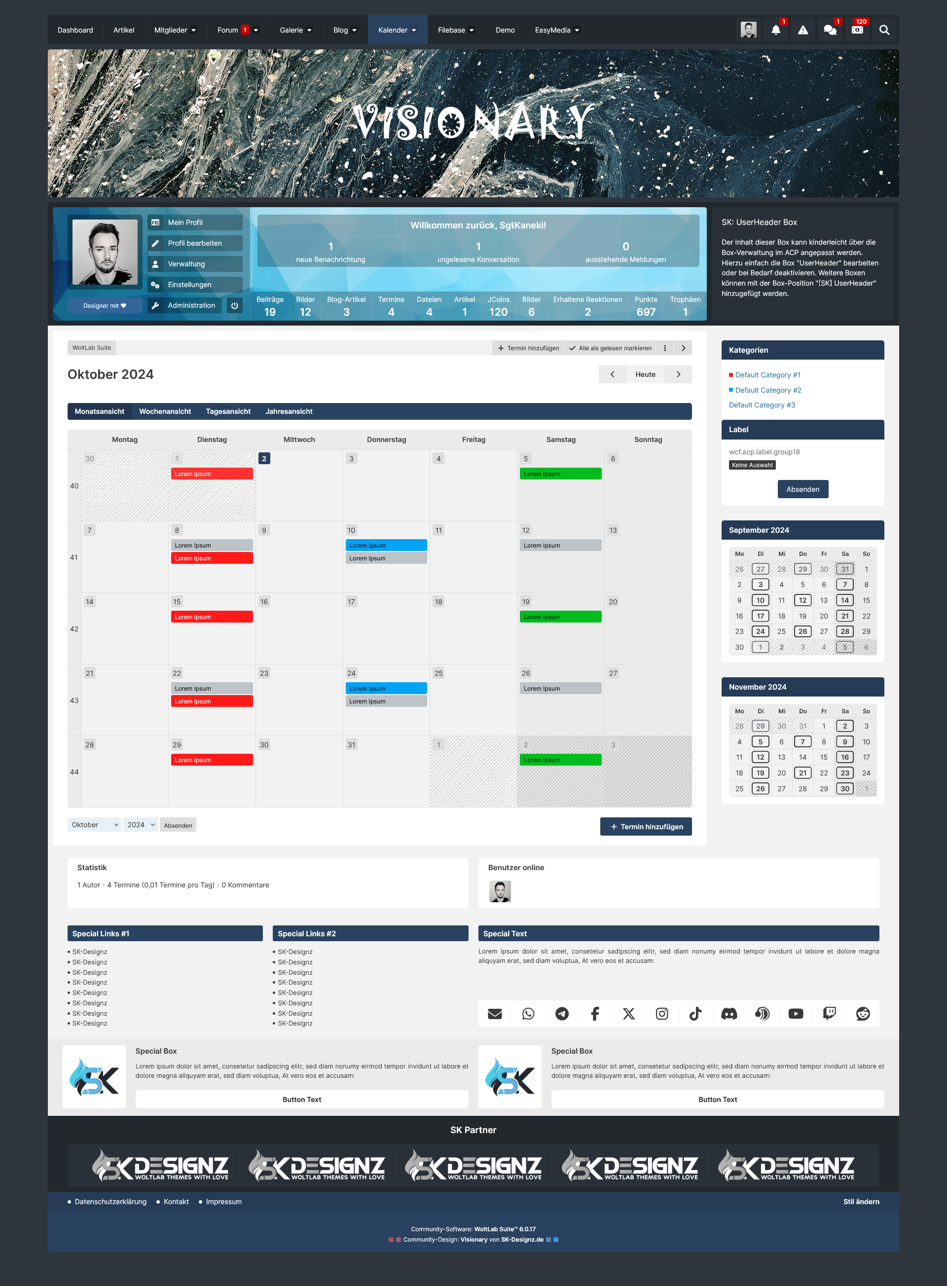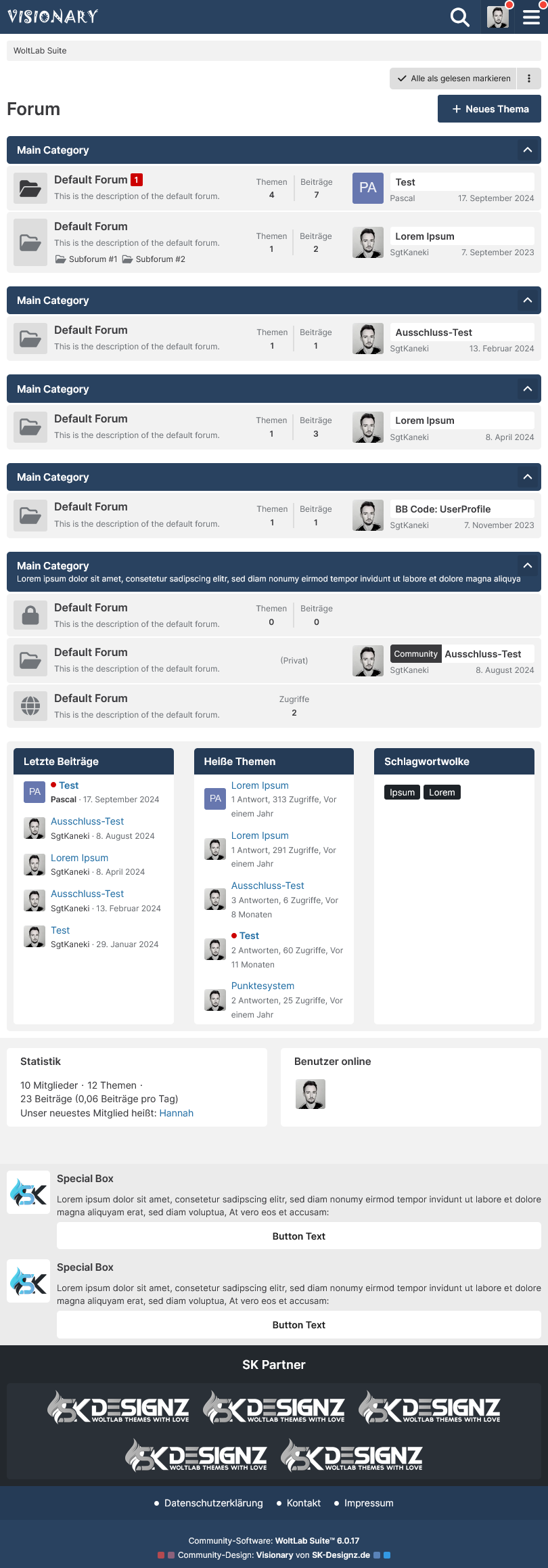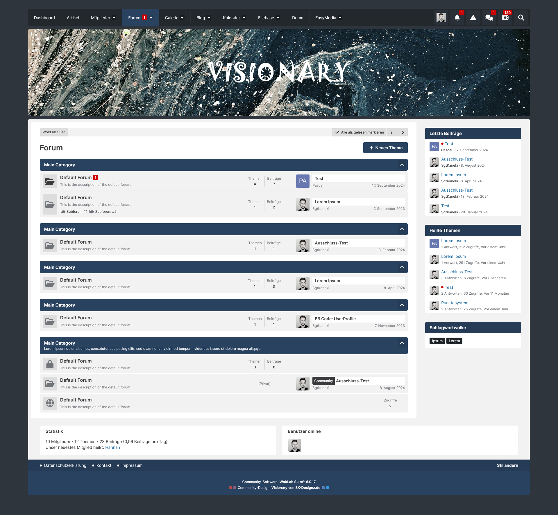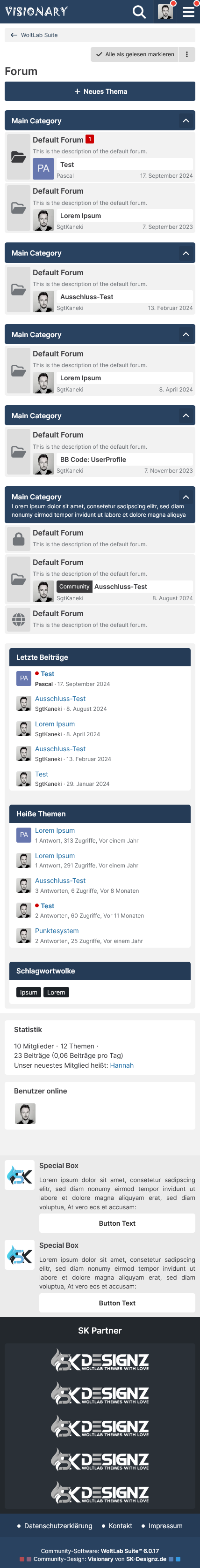 Mit der Benutzer-Box erhalten Ihre Benutzer eine sinnvolle Übersicht des eigenen Benutzerprofils prominent unter dem Header der Seite platziert. Dort befinden sich sowohl die wichtigsten Shortcuts um das eigene Profil zu verwalten, als auch die eigenen Statistiken und Benachrichtungen im Überblick zu behalten. Für Gäste hingegen bietet diese Box die Möglichkeit eine kurze Beschreibung Ihrer Website zu hinterlegen und die Möglichkeit sich entweder einzuloggen oder ein Benutzerkonto zu erstellen.