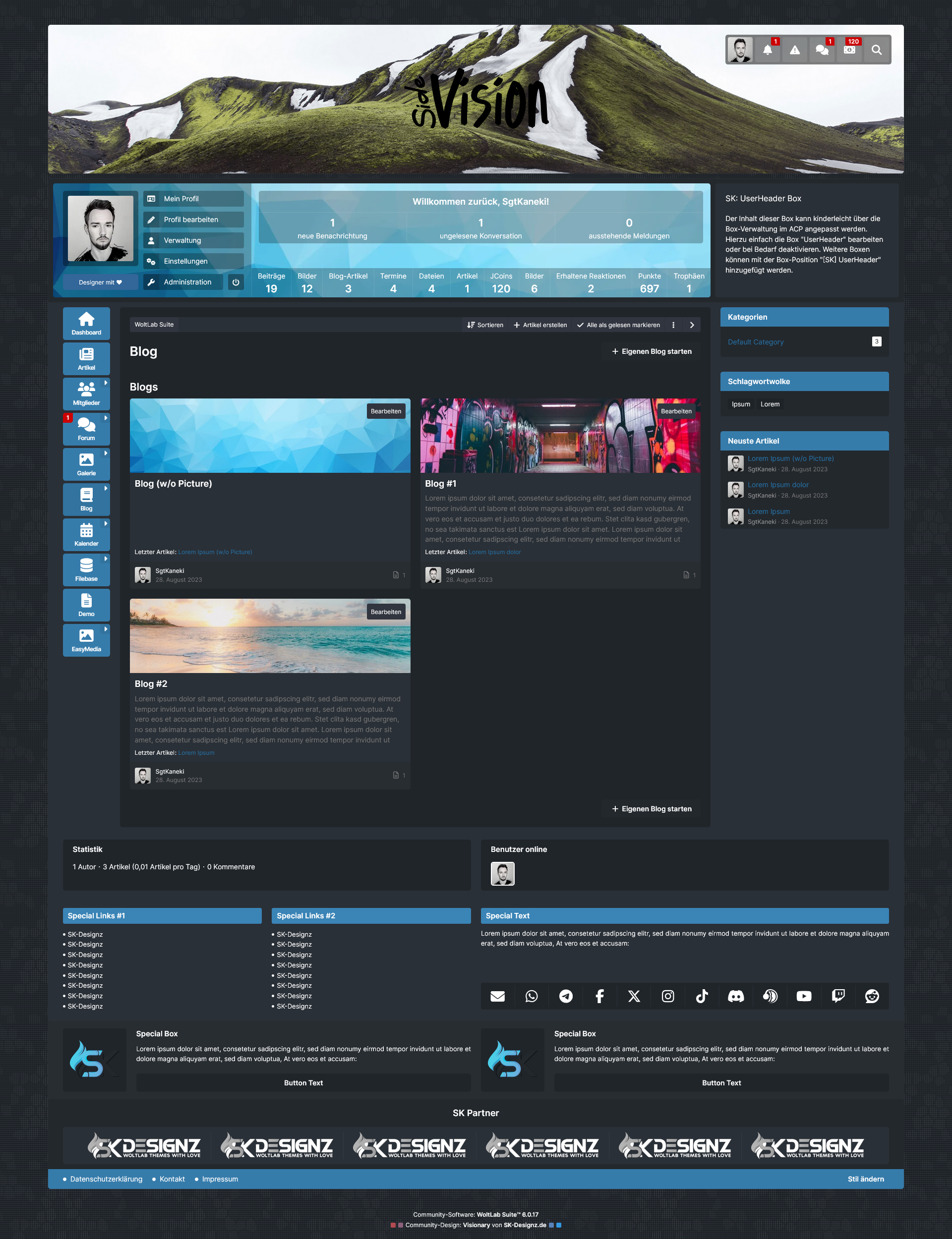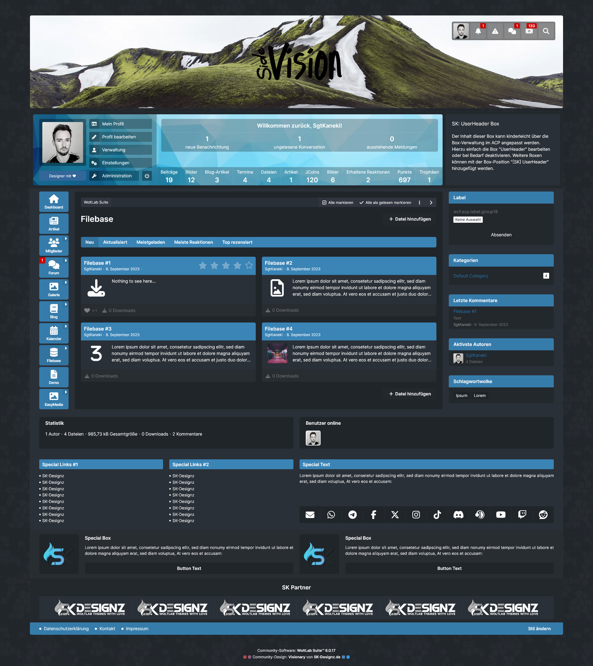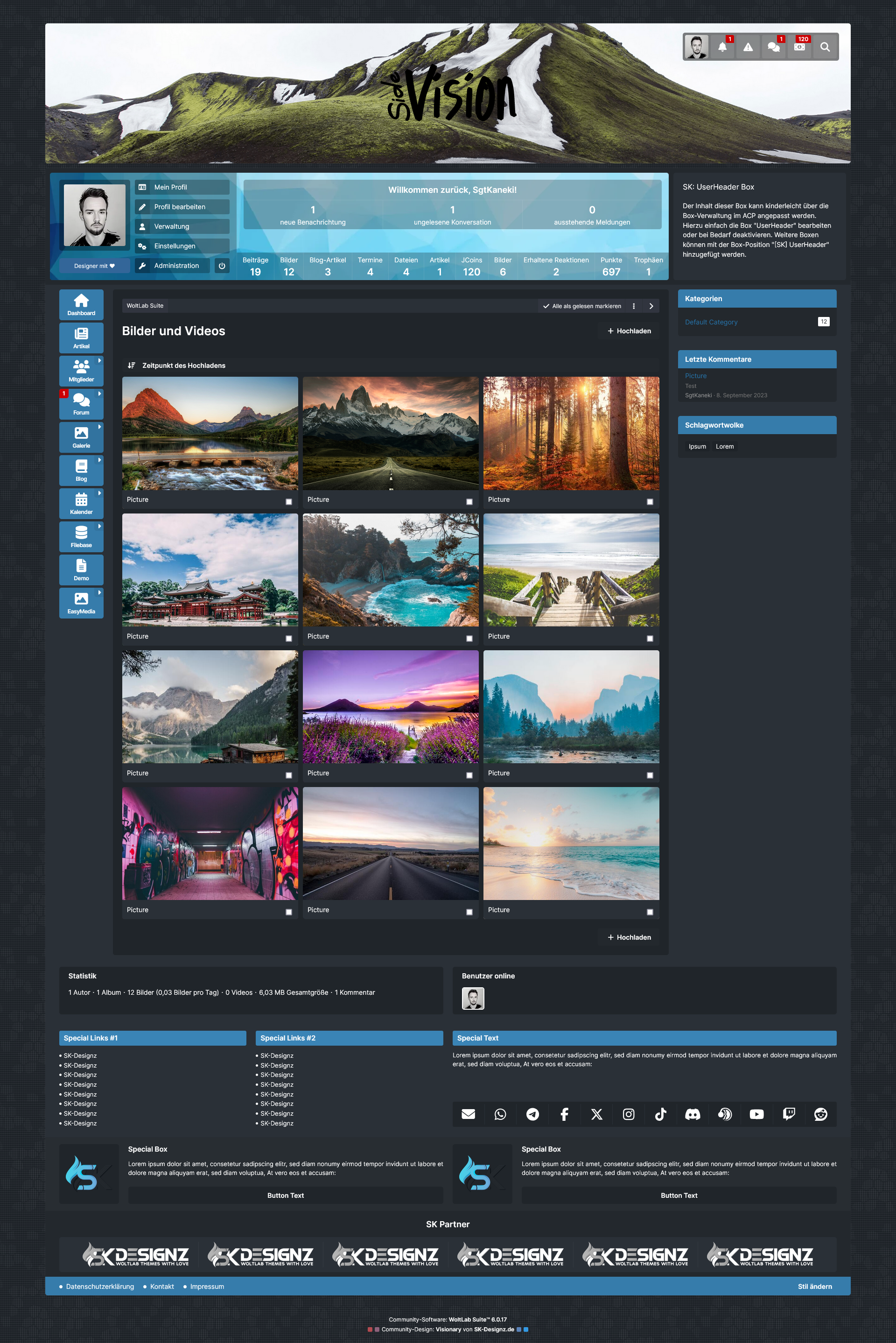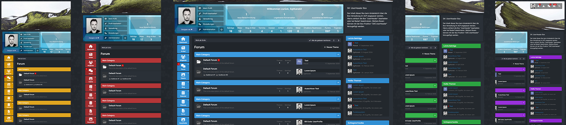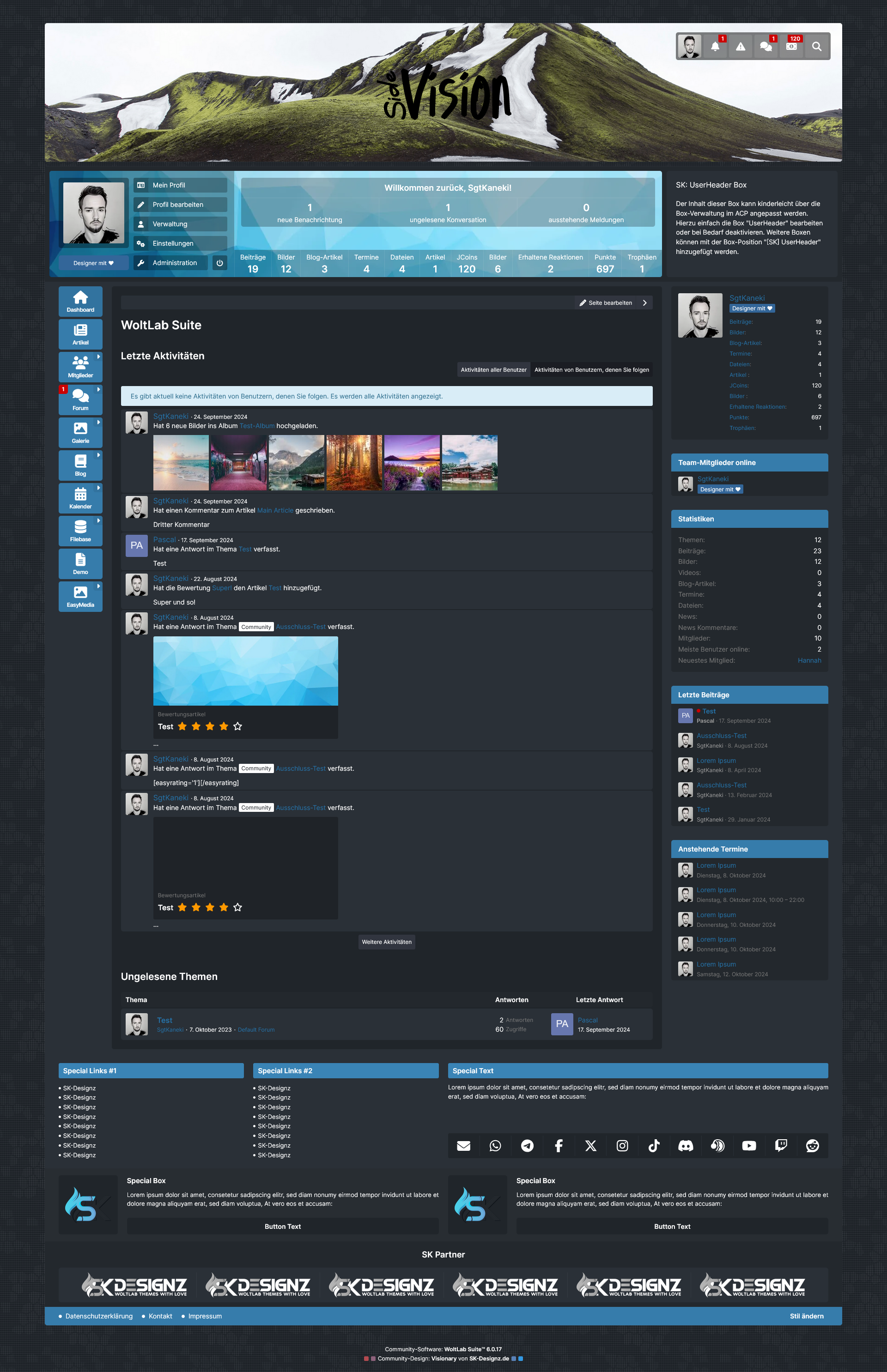 Mit der Benutzer-Box erhalten Ihre Benutzer eine sinnvolle Übersicht des eigenen Benutzerprofils prominent unter dem Header der Seite platziert. Dort befinden sich sowohl die wichtigsten Shortcuts um das eigene Profil zu verwalten, als auch die eigenen Statistiken und Benachrichtungen im Überblick zu behalten. Für Gäste hingegen bietet diese Box die Möglichkeit eine kurze Beschreibung Ihrer Website zu hinterlegen und die Möglichkeit sich entweder einzuloggen oder ein Benutzerkonto zu erstellen.
