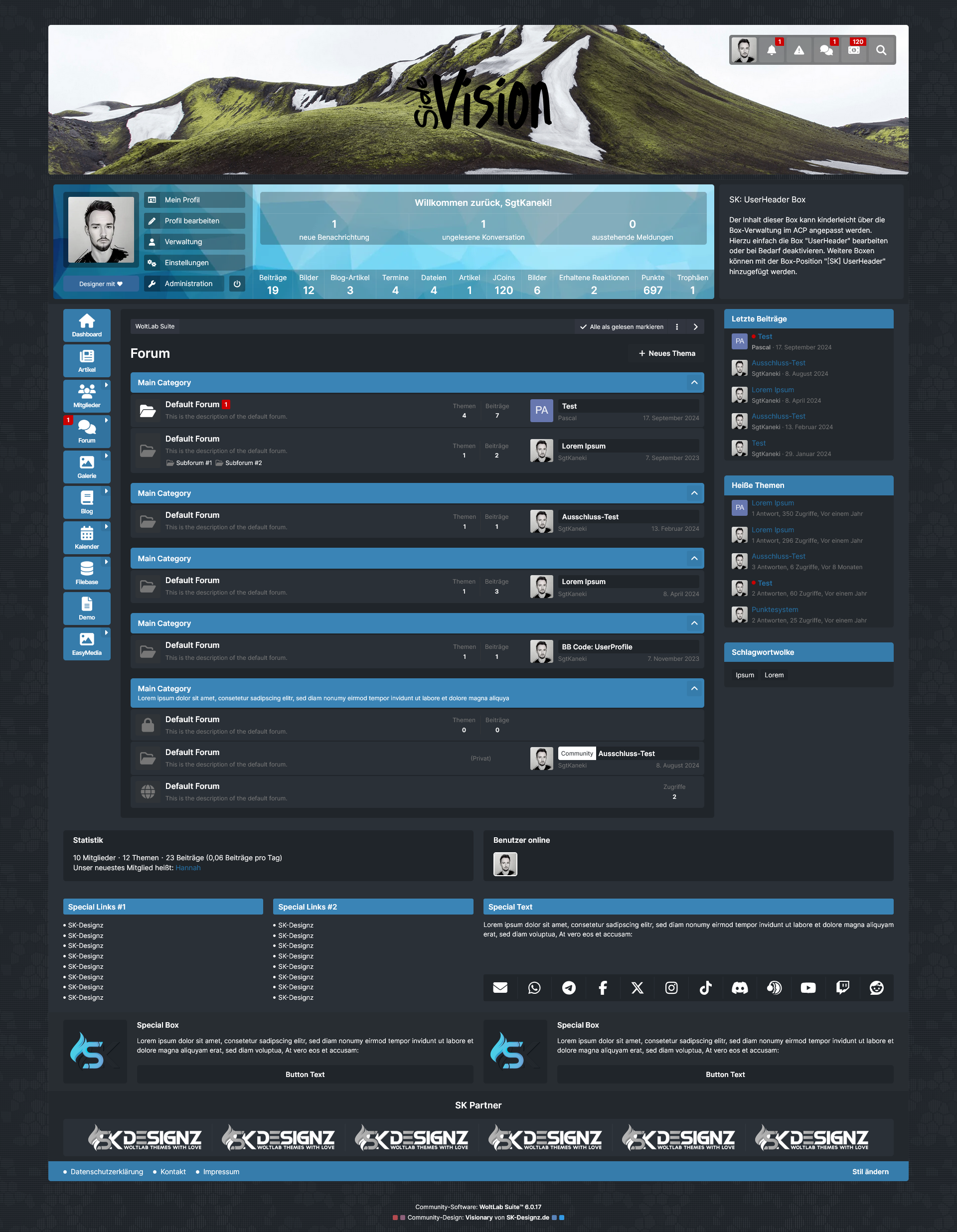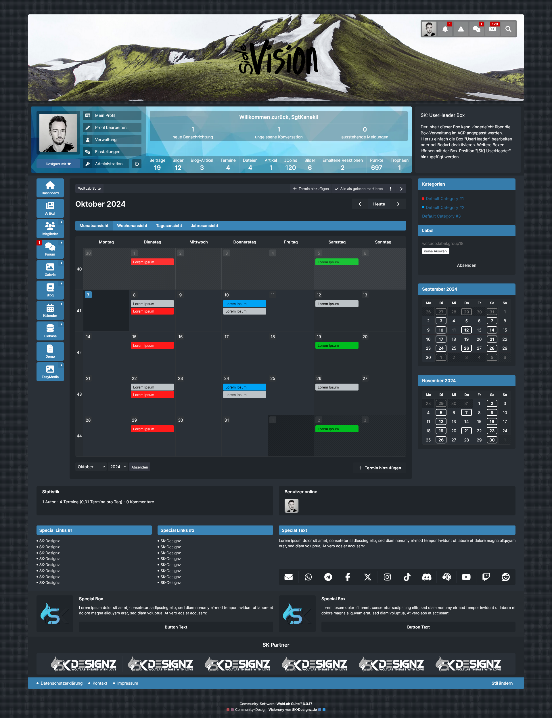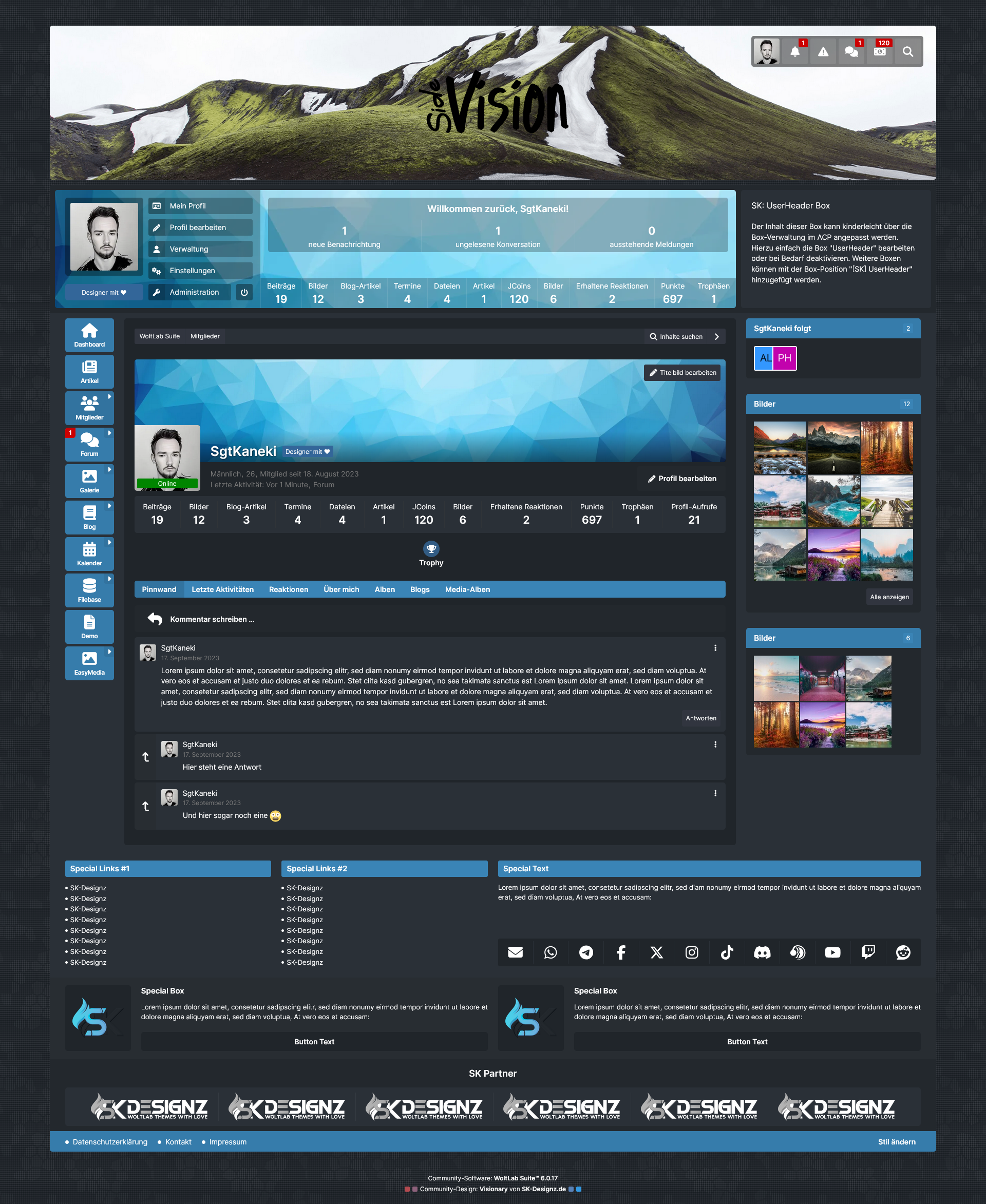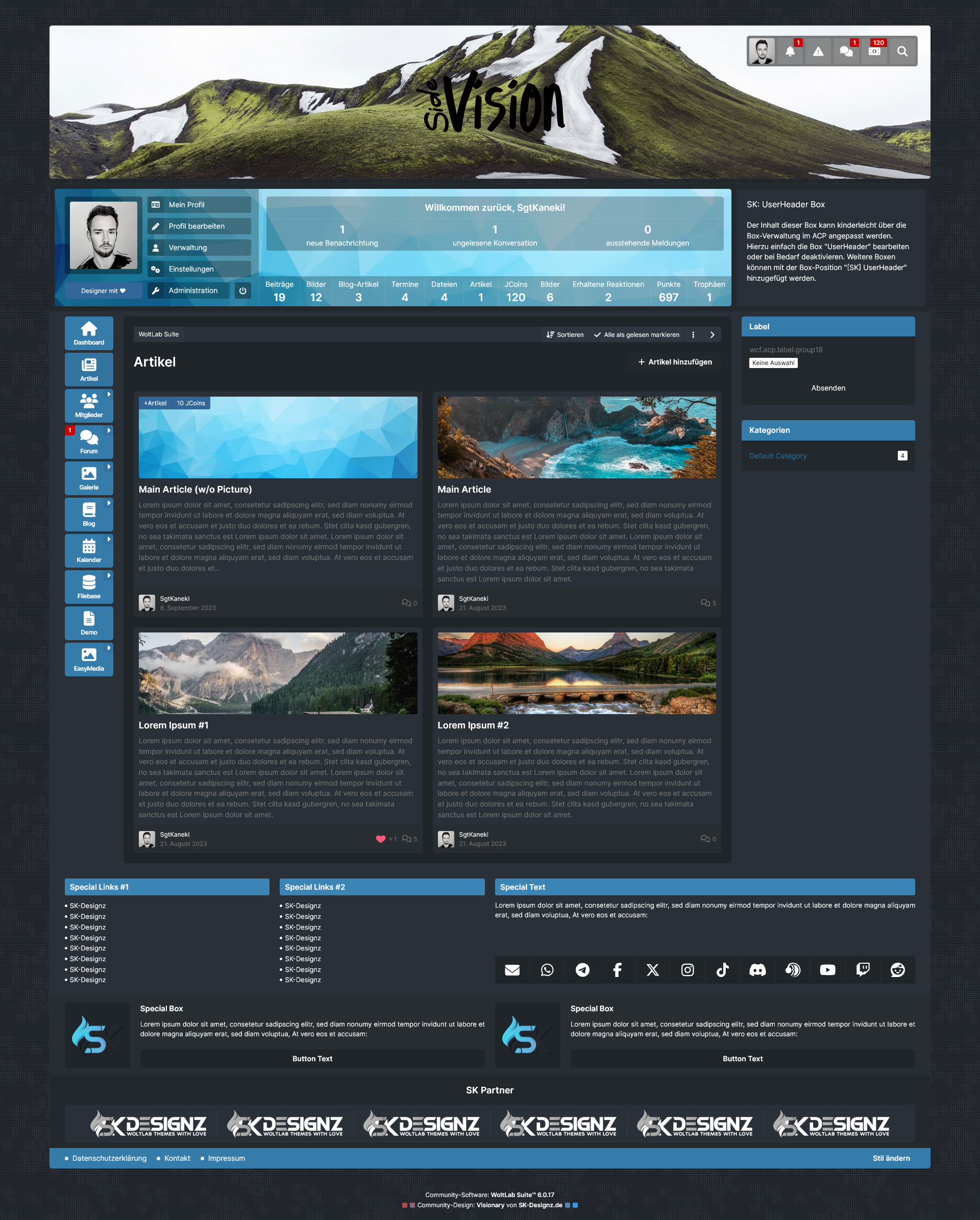 Mit der Benutzer-Box erhalten Ihre Benutzer eine sinnvolle Übersicht des eigenen Benutzerprofils prominent unter dem Header der Seite platziert. Dort befinden sich sowohl die wichtigsten Shortcuts um das eigene Profil zu verwalten, als auch die eigenen Statistiken und Benachrichtungen im Überblick zu behalten. Für Gäste hingegen bietet diese Box die Möglichkeit eine kurze Beschreibung Ihrer Website zu hinterlegen und die Möglichkeit sich entweder einzuloggen oder ein Benutzerkonto zu erstellen.
