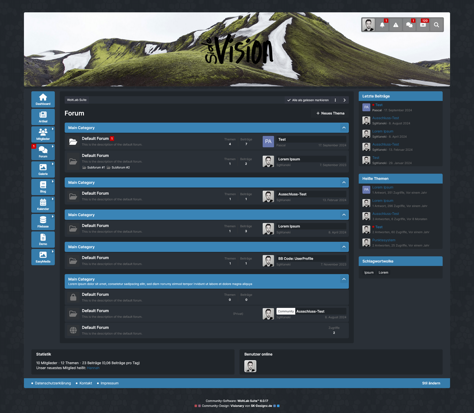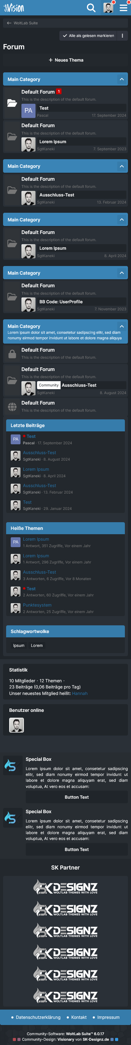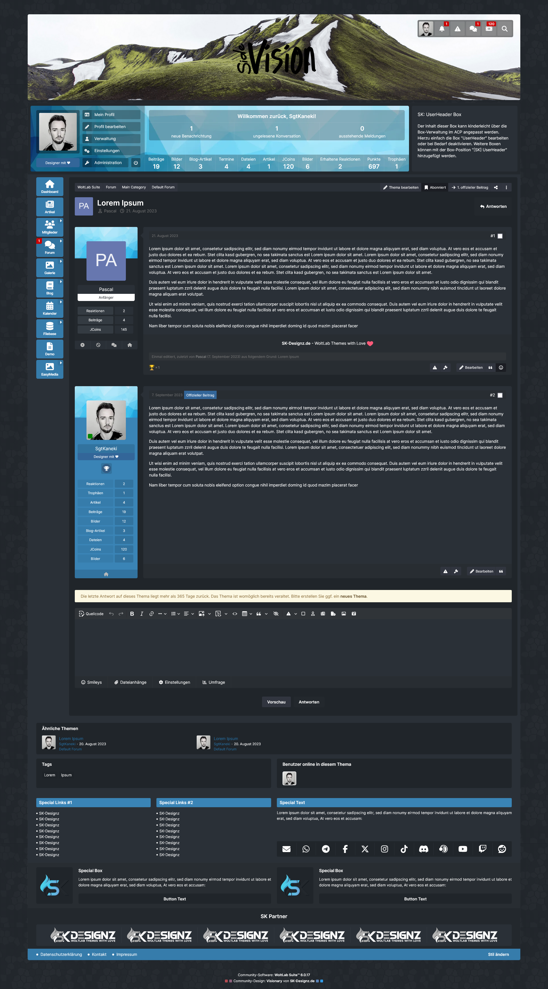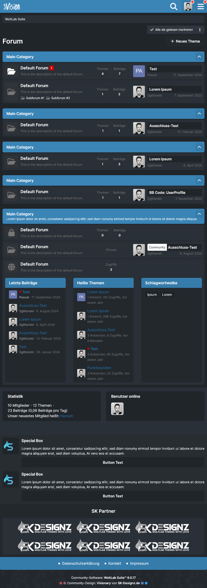 Mit der Benutzer-Box erhalten Ihre Benutzer eine sinnvolle Übersicht des eigenen Benutzerprofils prominent unter dem Header der Seite platziert. Dort befinden sich sowohl die wichtigsten Shortcuts um das eigene Profil zu verwalten, als auch die eigenen Statistiken und Benachrichtungen im Überblick zu behalten. Für Gäste hingegen bietet diese Box die Möglichkeit eine kurze Beschreibung Ihrer Website zu hinterlegen und die Möglichkeit sich entweder einzuloggen oder ein Benutzerkonto zu erstellen.