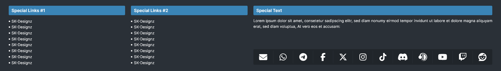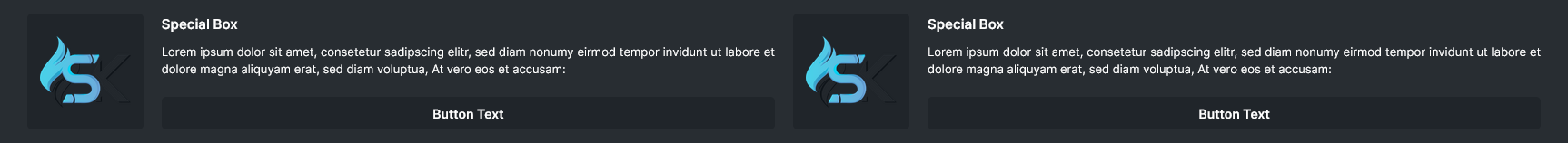 Mit diesen beiden InfoBoxen Sie die Möglichkeit wichtige Verlinkungen / Informationen übersicht direkt unter dem eigentlichen Content zu platzieren. Es besteht die Möglichkeit sowohl ein Icon, als auch ein Button samt Verlinkung Ihren Benutzern zur Verfügung zu stellen. Dort können beispielsweise der eigene Discord / TeamSpeak oder auch GameServer beworben werden, die Möglichkeiten sind hier allerdings (nahezu) unbegrenzt.